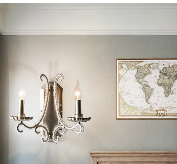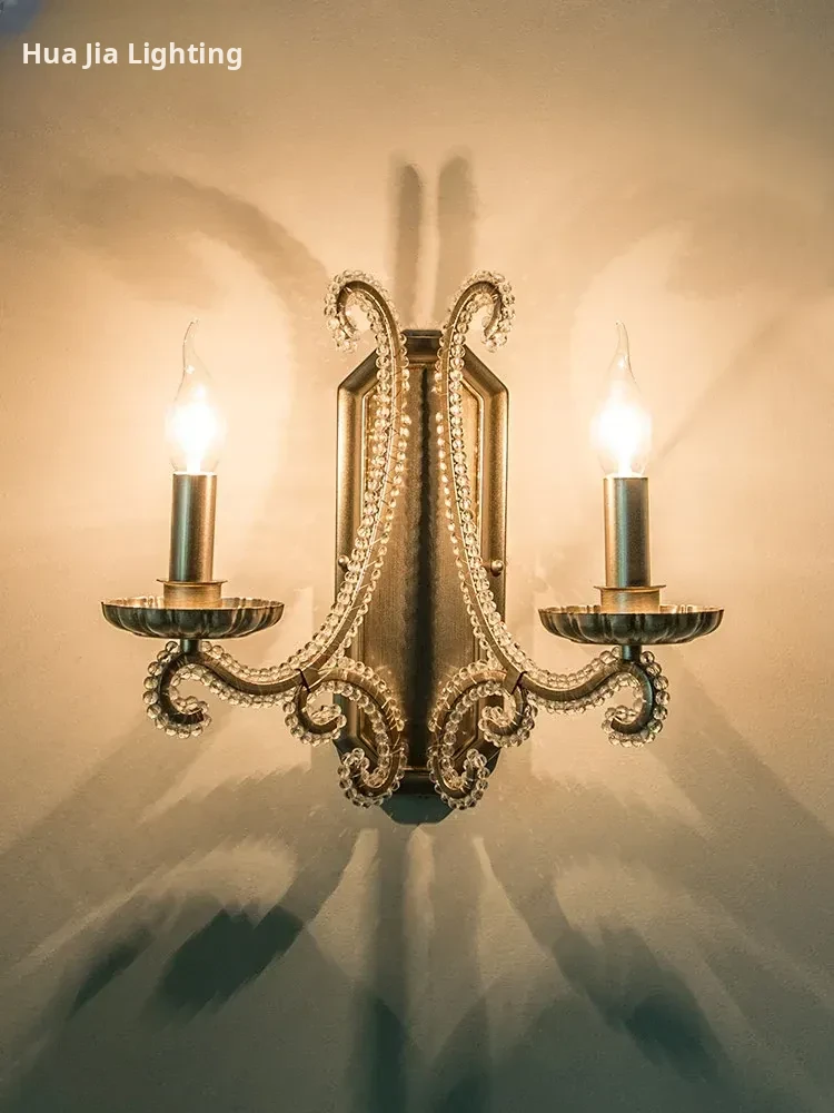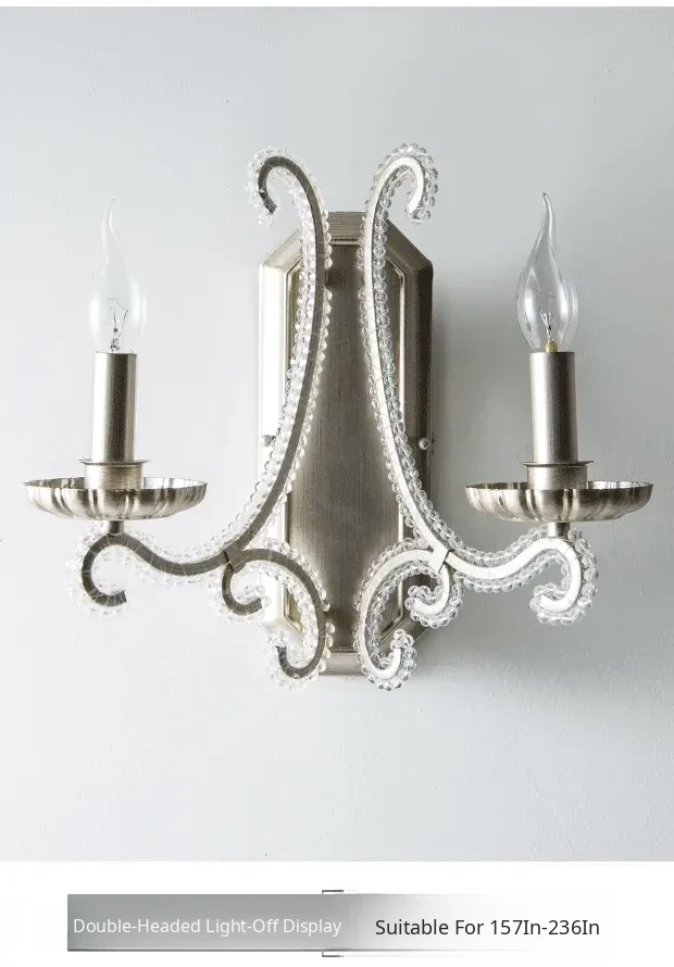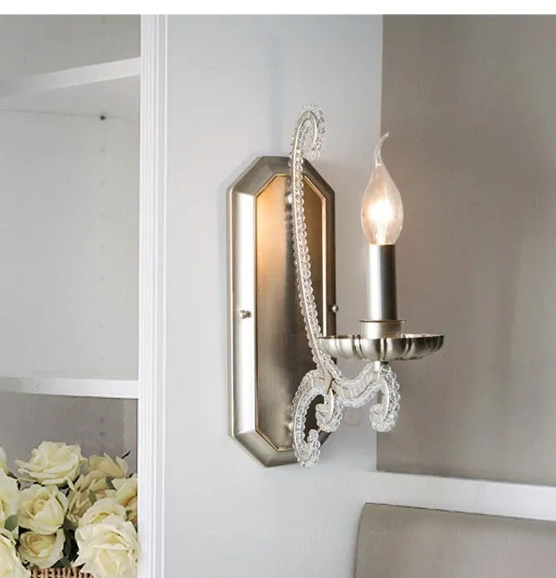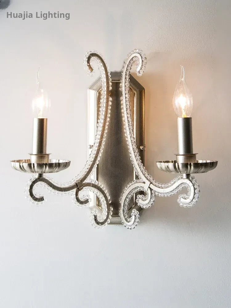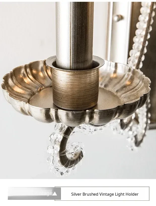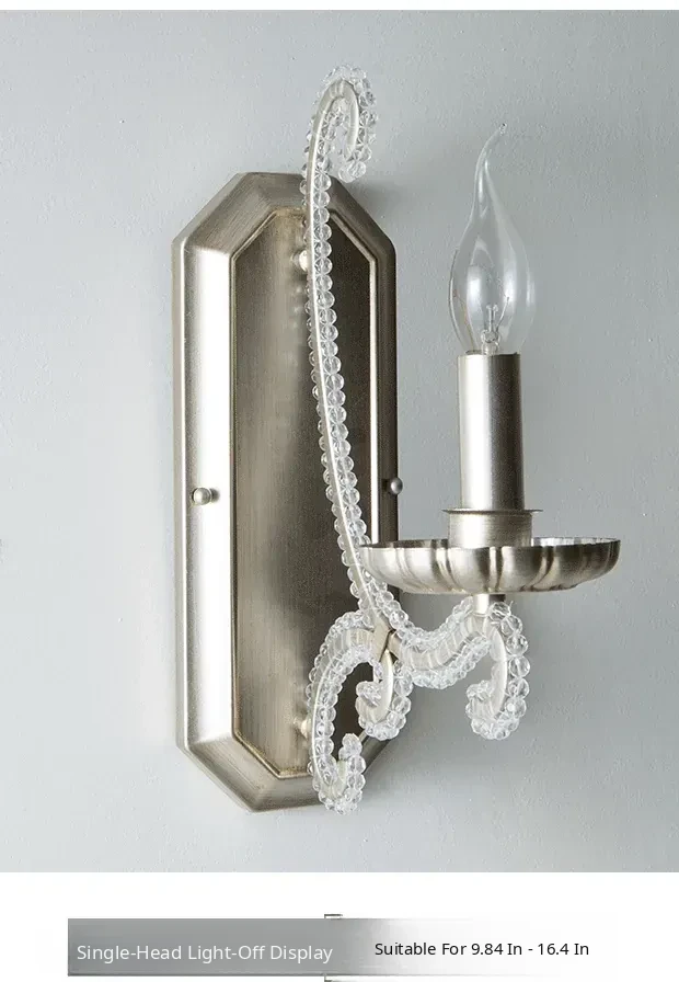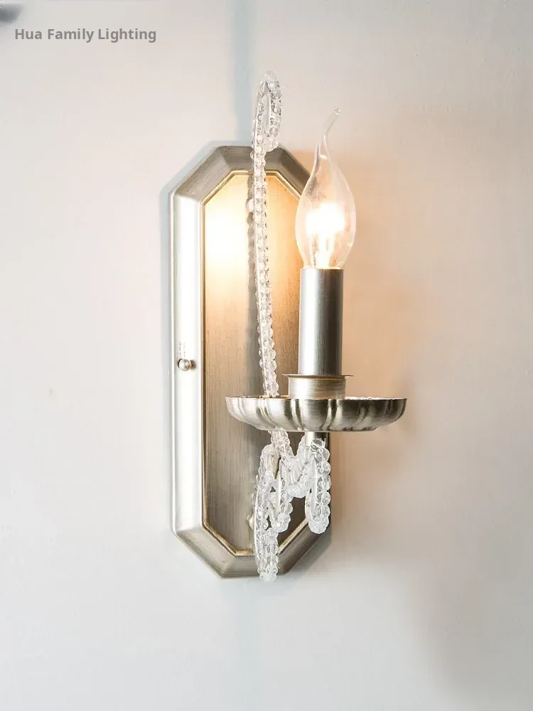 American Style Living Room Wall Lamp - Rustic Iron Bedside Light, Vintage Silver Hallway Creative French Crystal Wall Sconce
