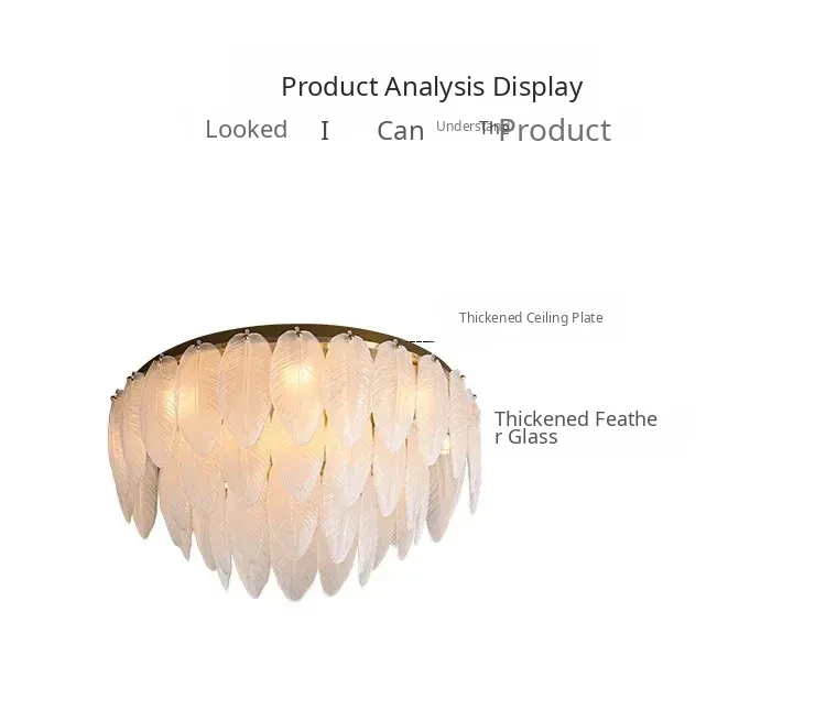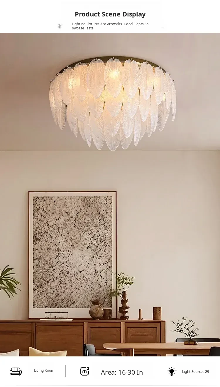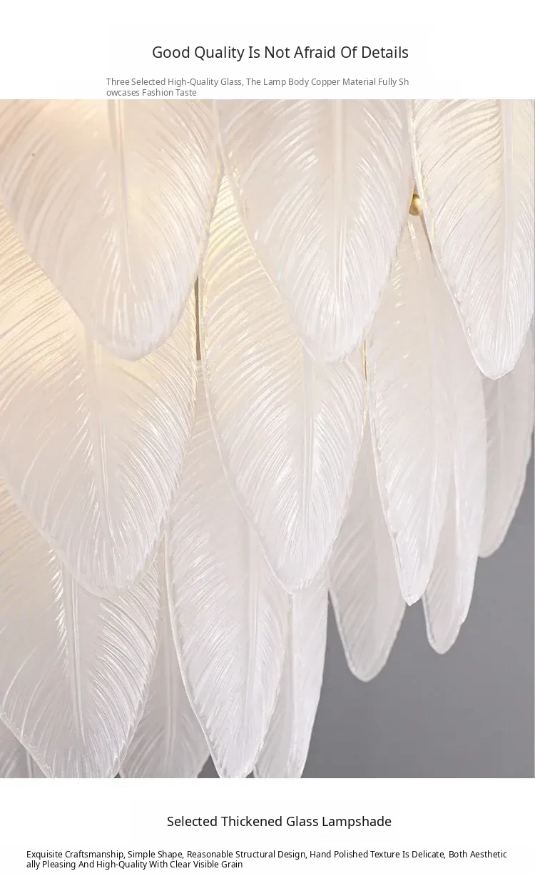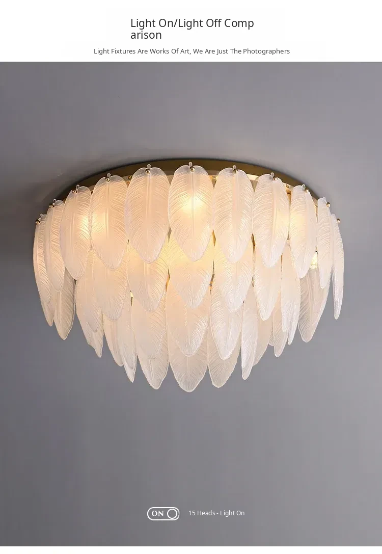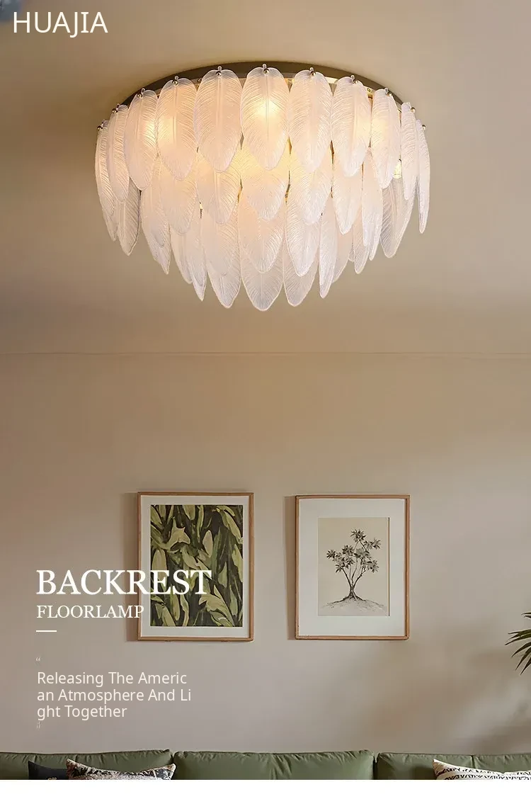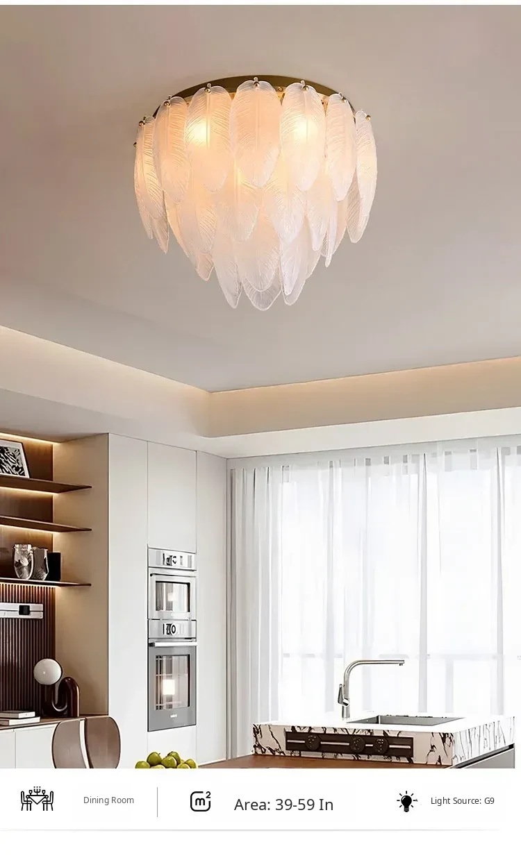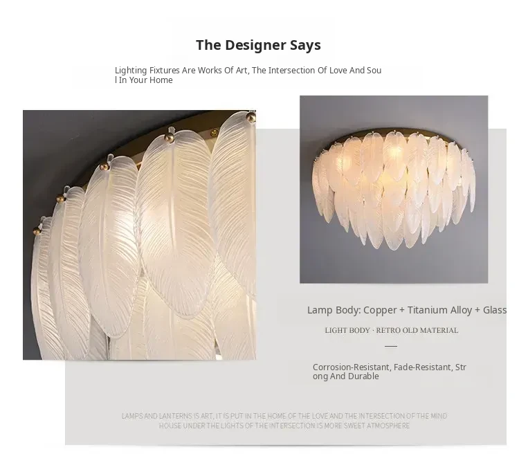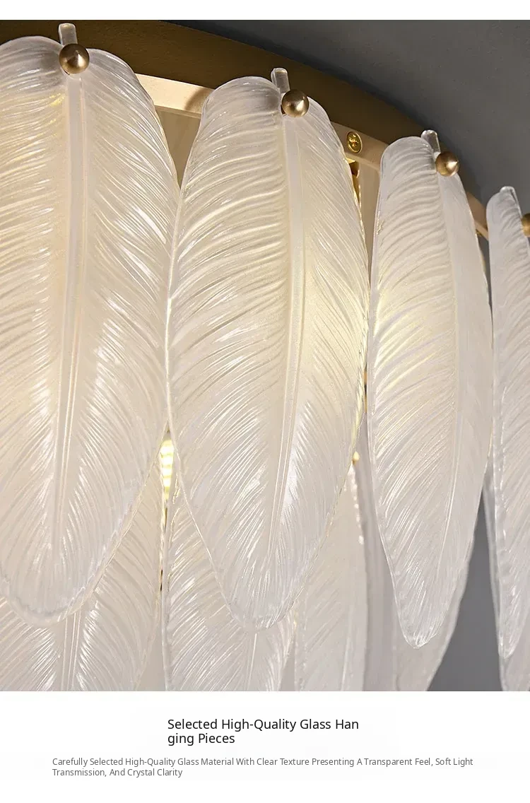French Luxury Feather Ceiling Light - All-Copper Ambient Lighting for Bedroom, Study, and Dining Room - Elegant Glass Ceiling Fixture