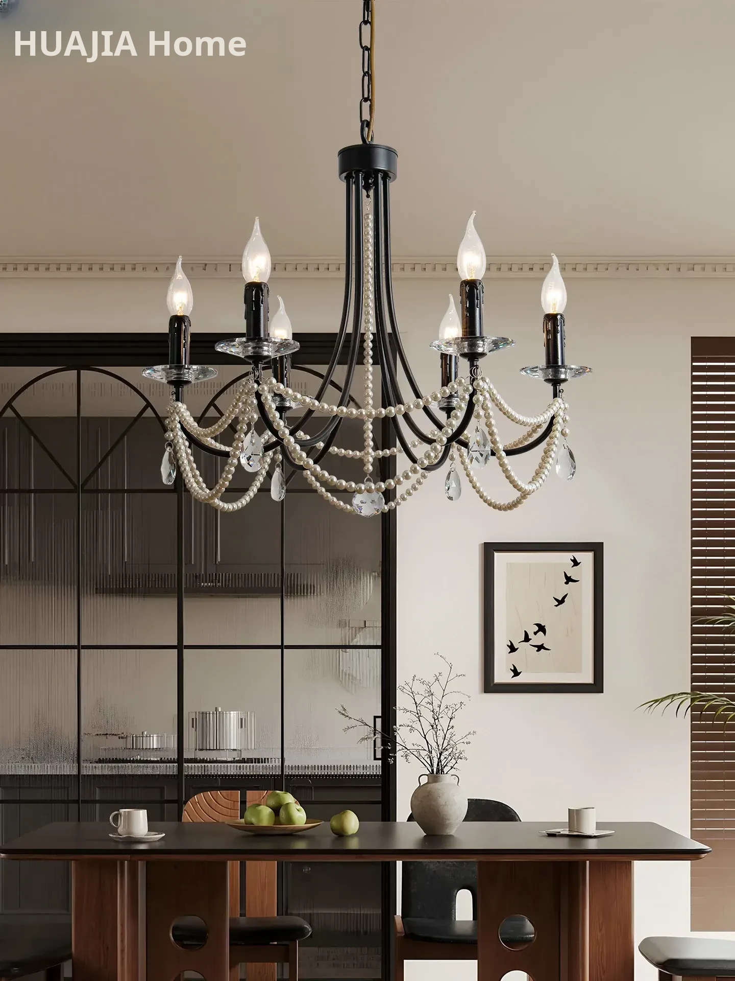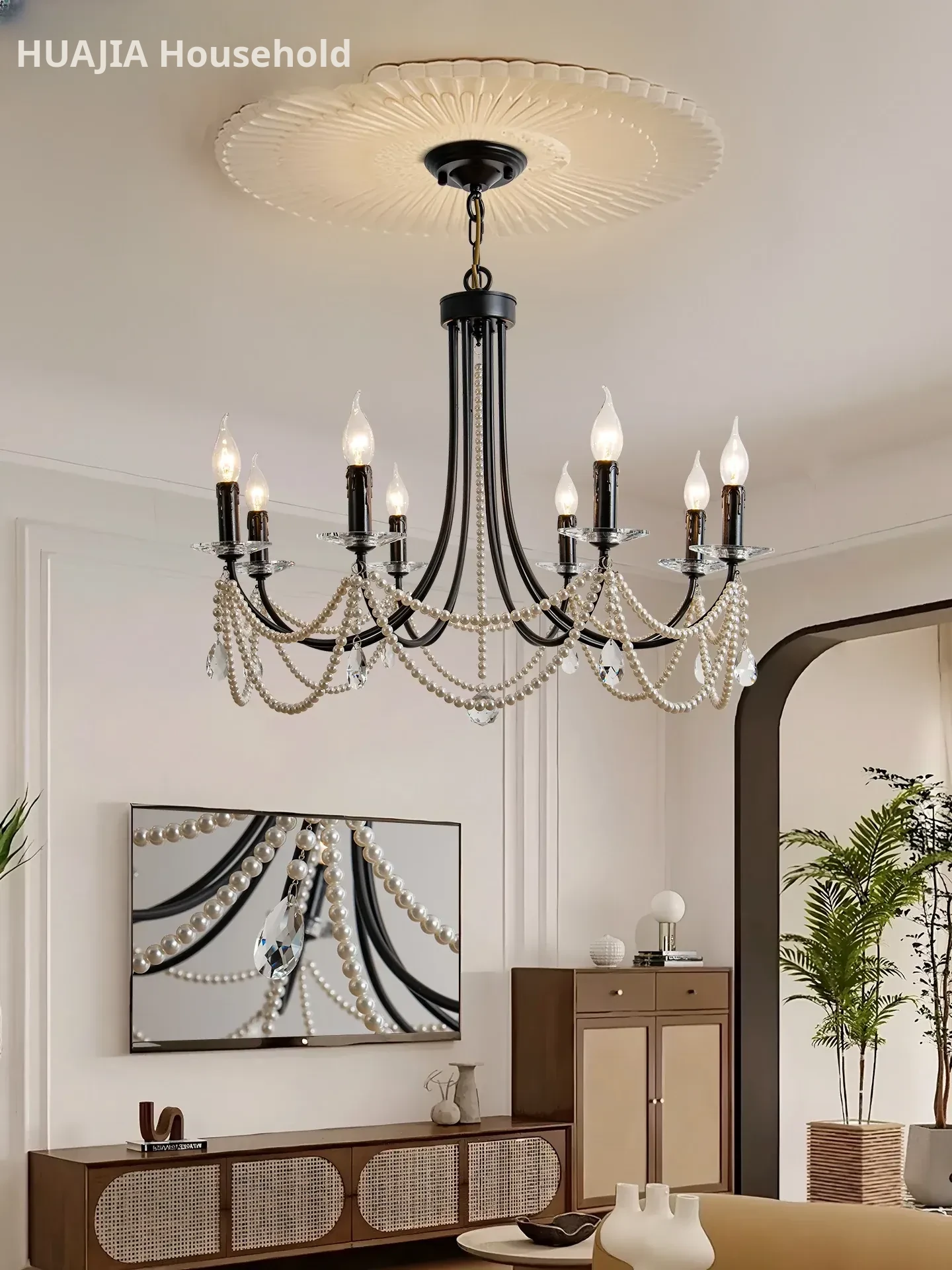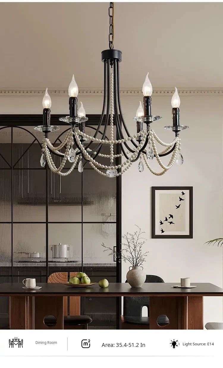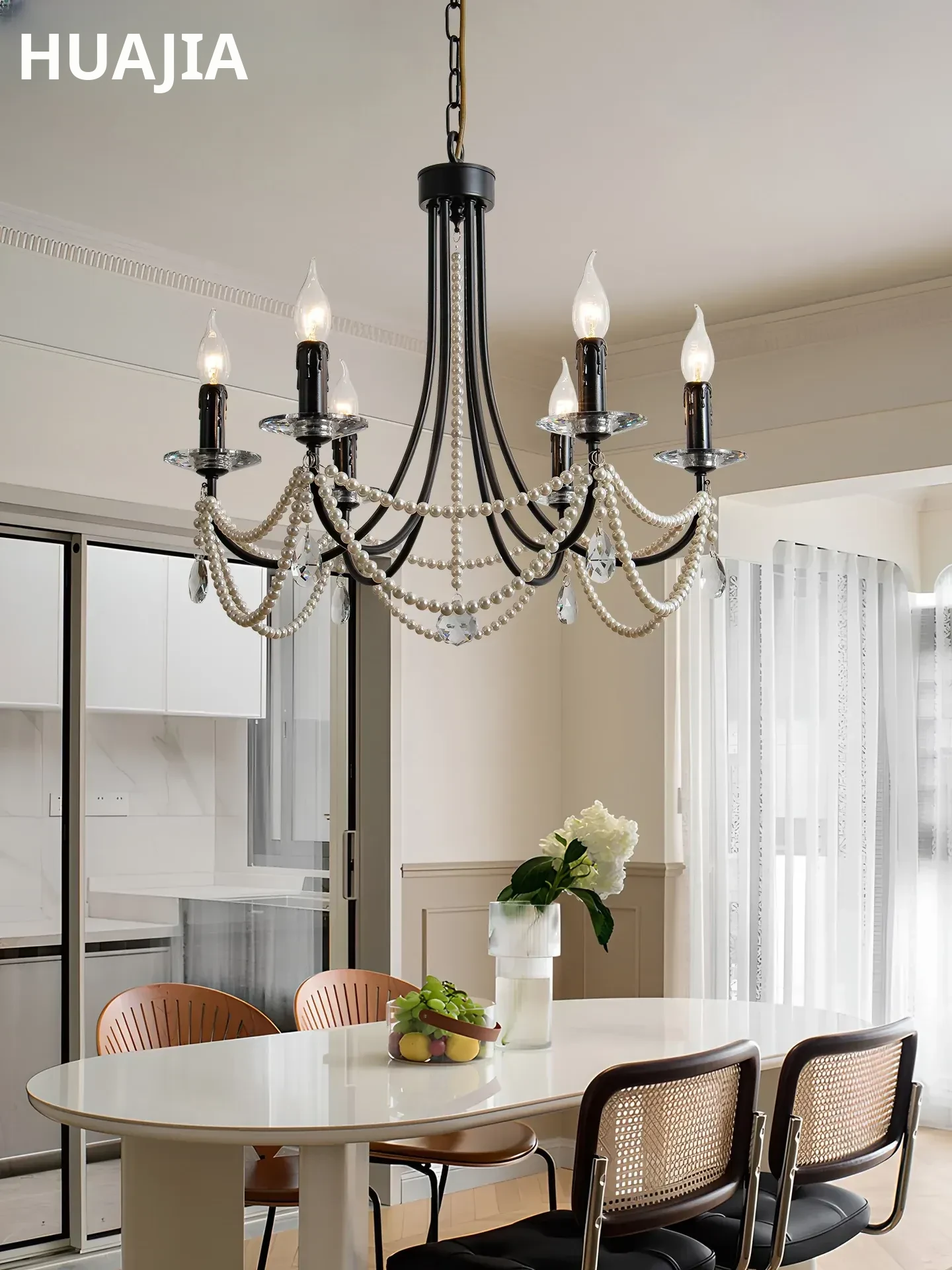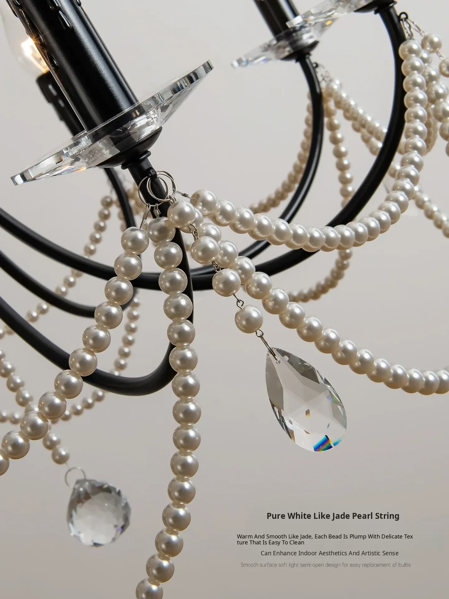 French Pearl Chandelier - Elegant Black Crystal Lighting for Living Room, Minimalist American Style Candle Lights for Bedroom and Dining Room - Perfect for Creating a Luxurious Atmosphere