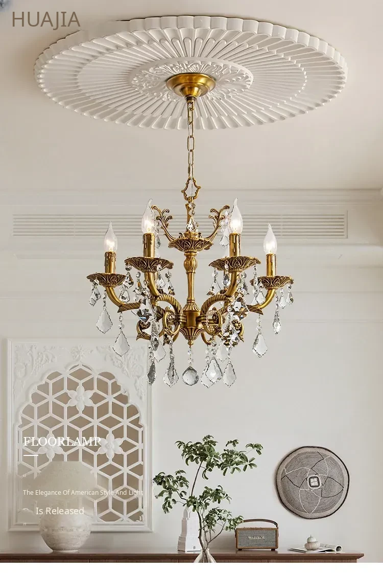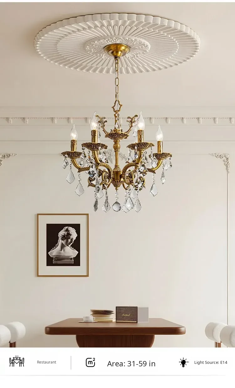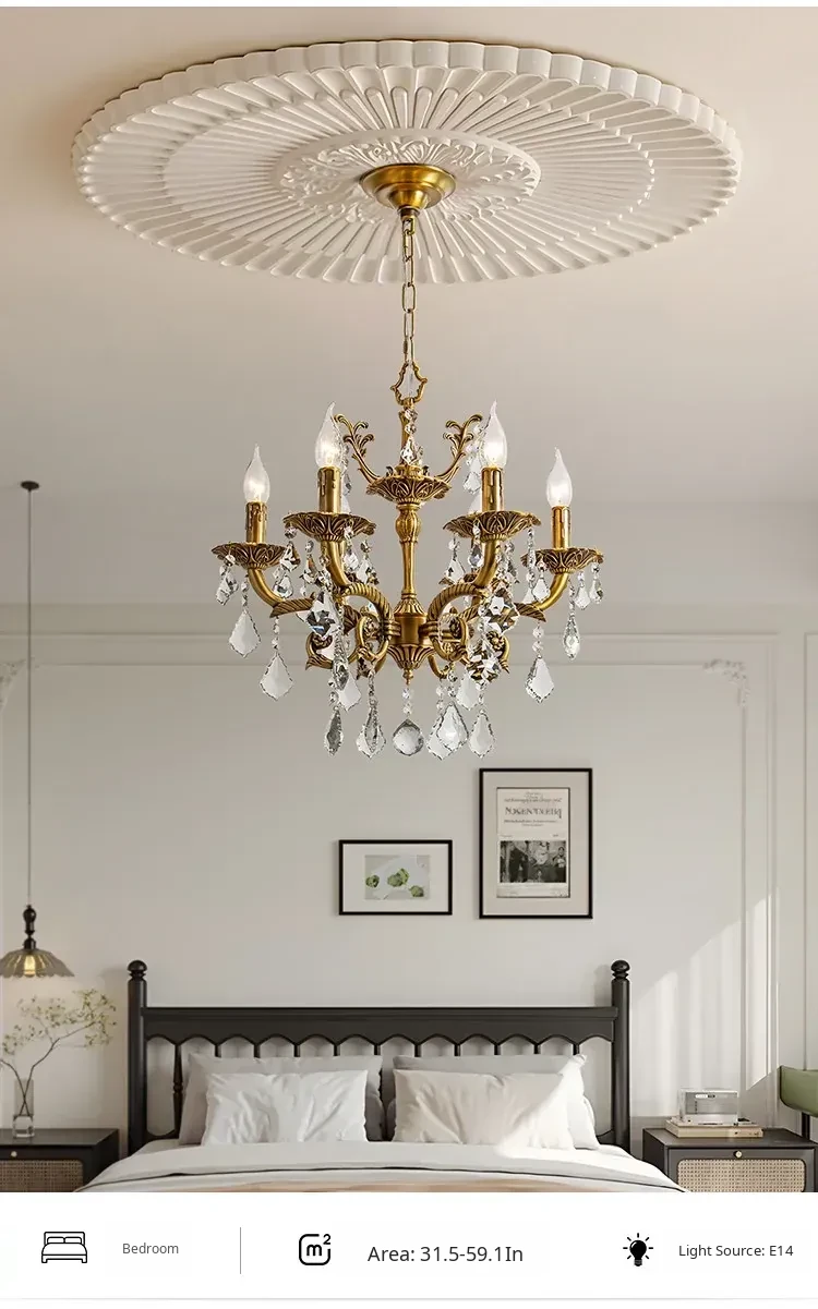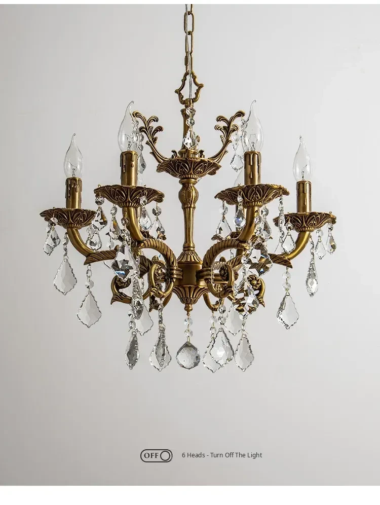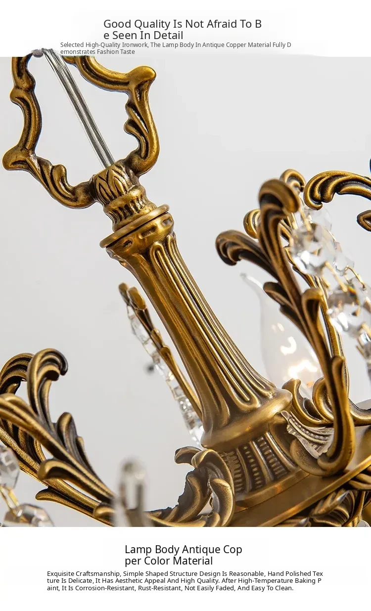 French Vintage Chandelier - Elegant Bedroom and Study Lighting, American Retro Crystal Pendant Light, Full Copper Candle Fixtures for Dining Room - Perfect Blend of Classic Charm and Modern Style!