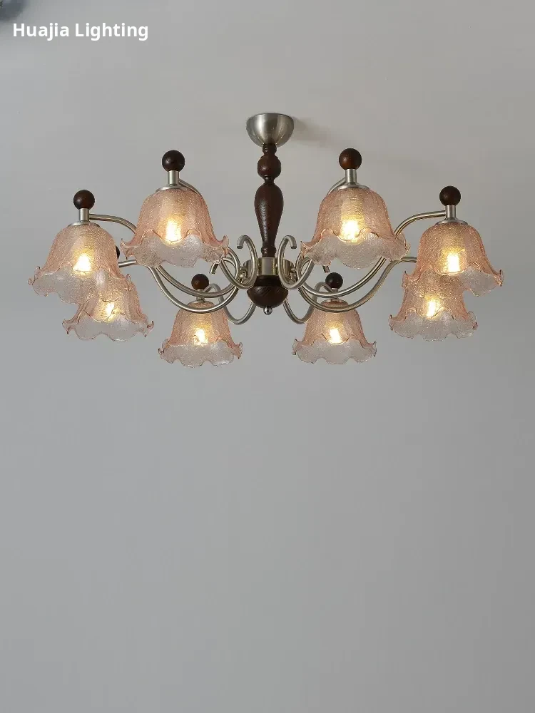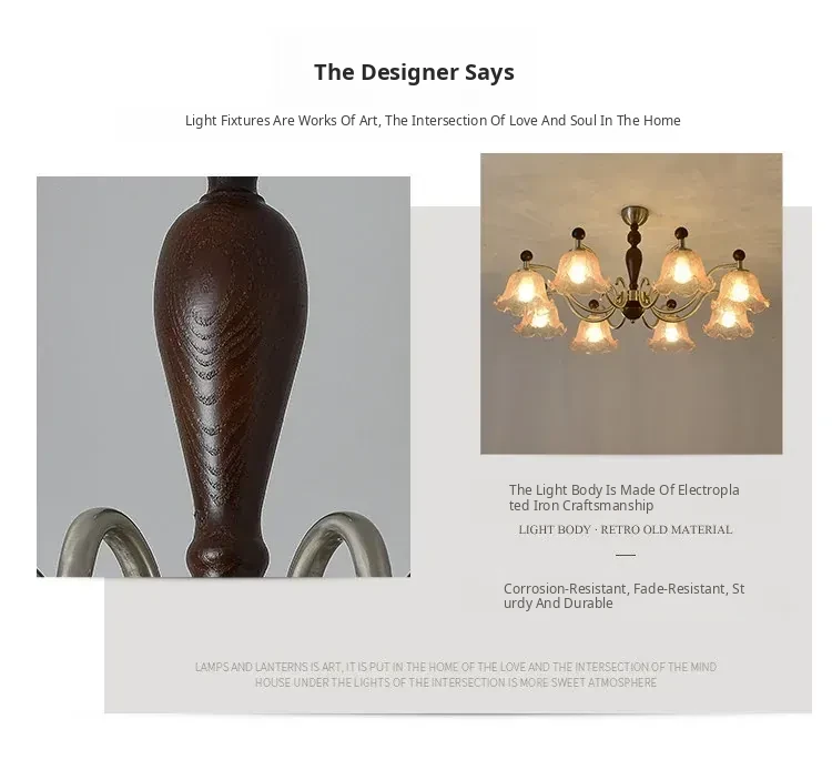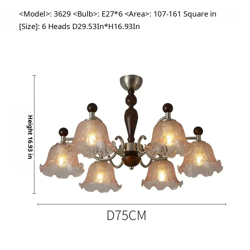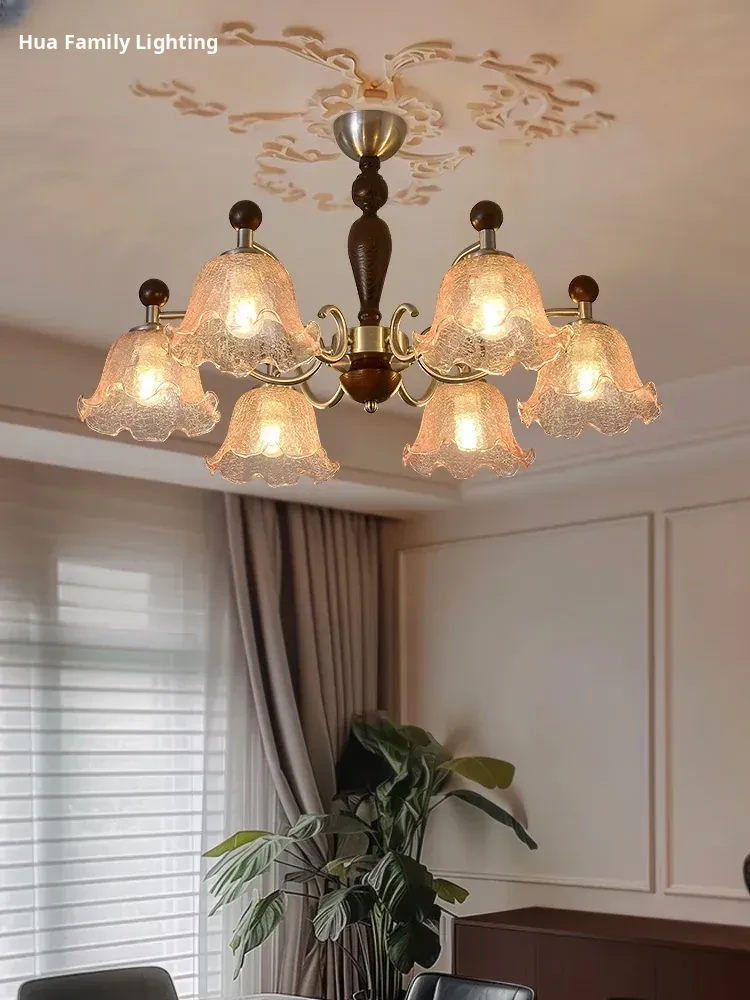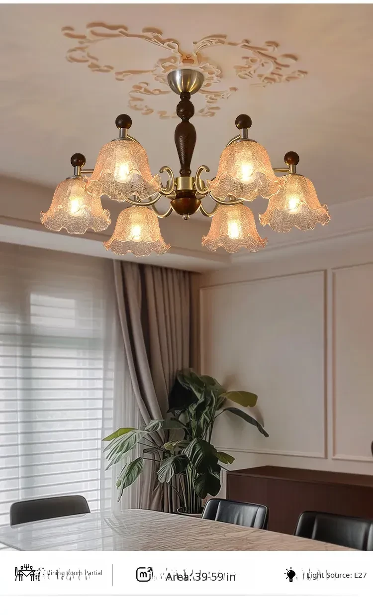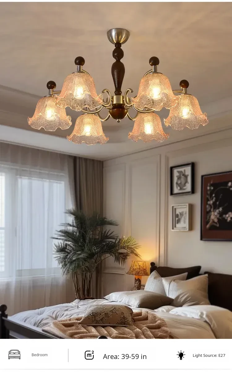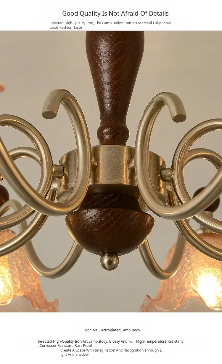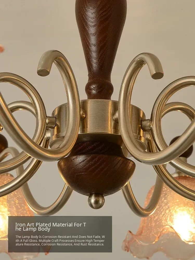 French Vintage Style Chandelier - Rustic Solid Wood Dining Light, Cozy Romantic Amber Glass Bedroom Pendant Lamp