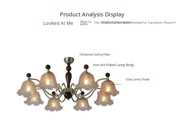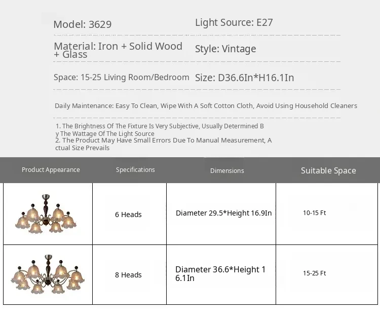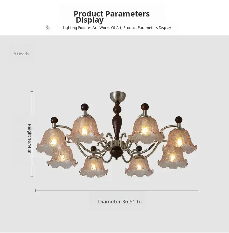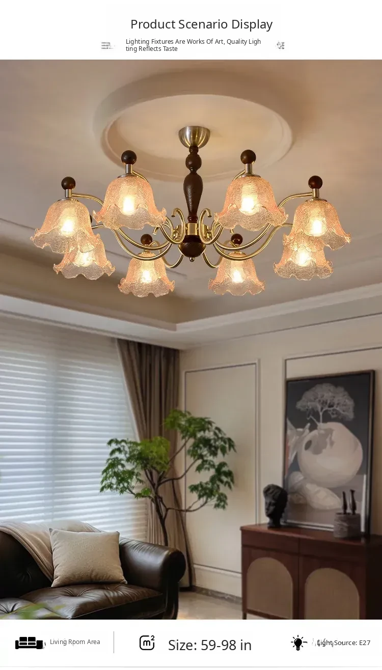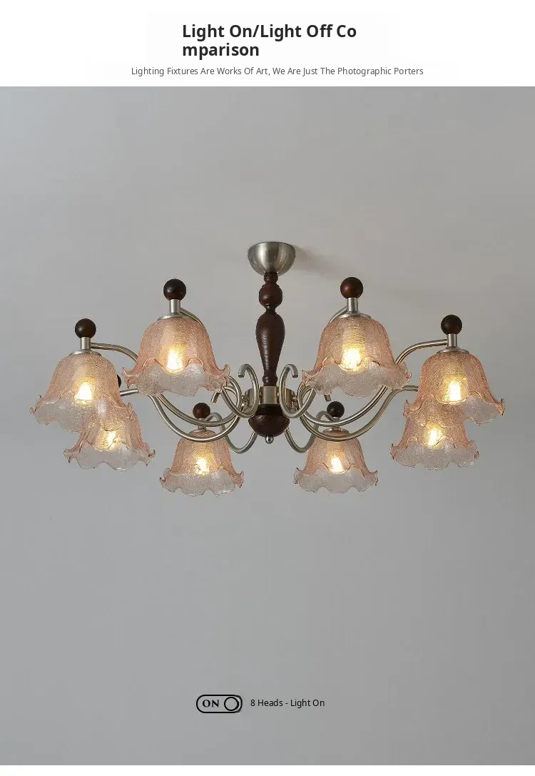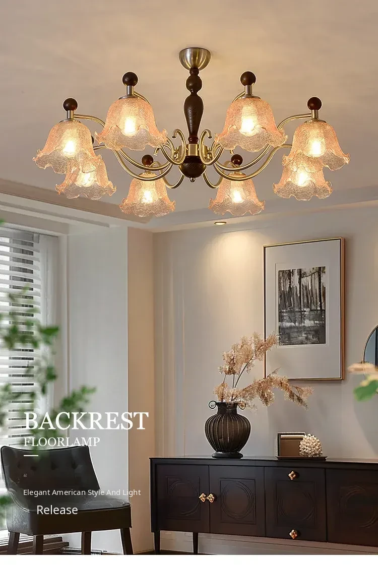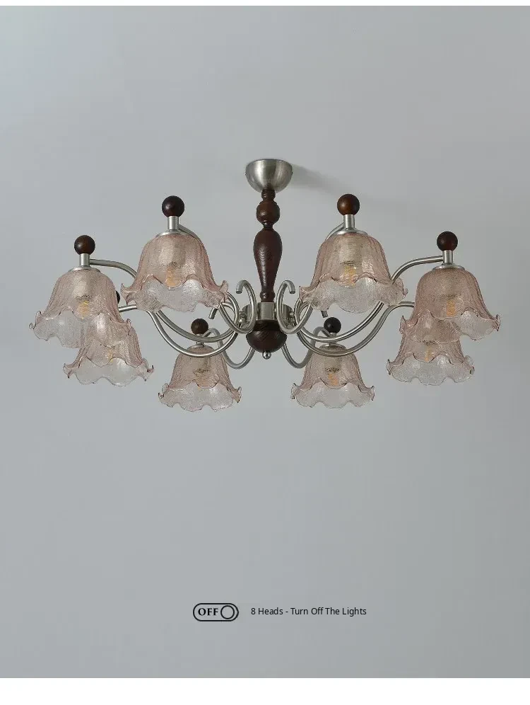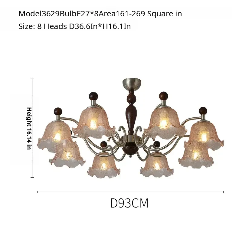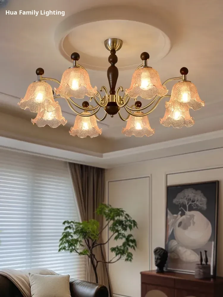 French Vintage Style Chandelier - Rustic Solid Wood Dining Light, Cozy Romantic Amber Glass Bedroom Pendant Lamp