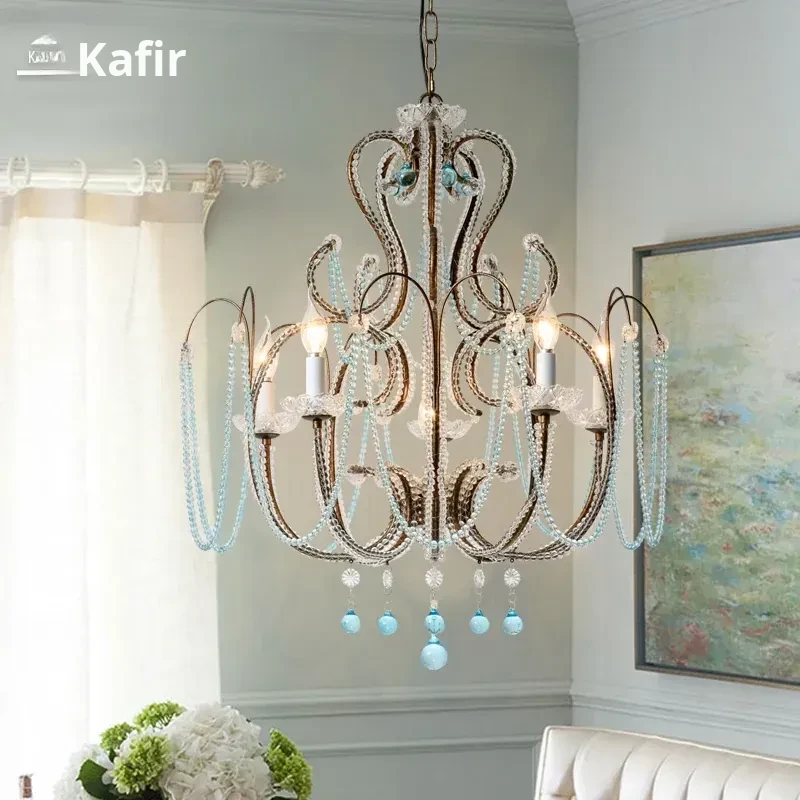 Rustic American Style Blue Crystal Chandelier - Modern Creative Art Light Fixture for Living Room, Cafés, and Dining Rooms - Unique Vintage Design to Enhance Your Space