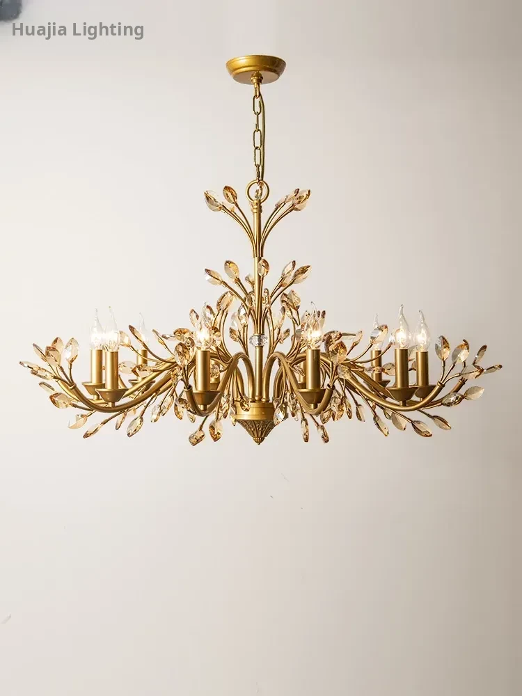 American Style All-Copper Crystal Chandelier - Elegant Vintage Luxury Lighting for Living Room and Bedroom, Featuring a Simple Yet Chic Design, Perfect for a Touch of Sophistication in Your Home Decor