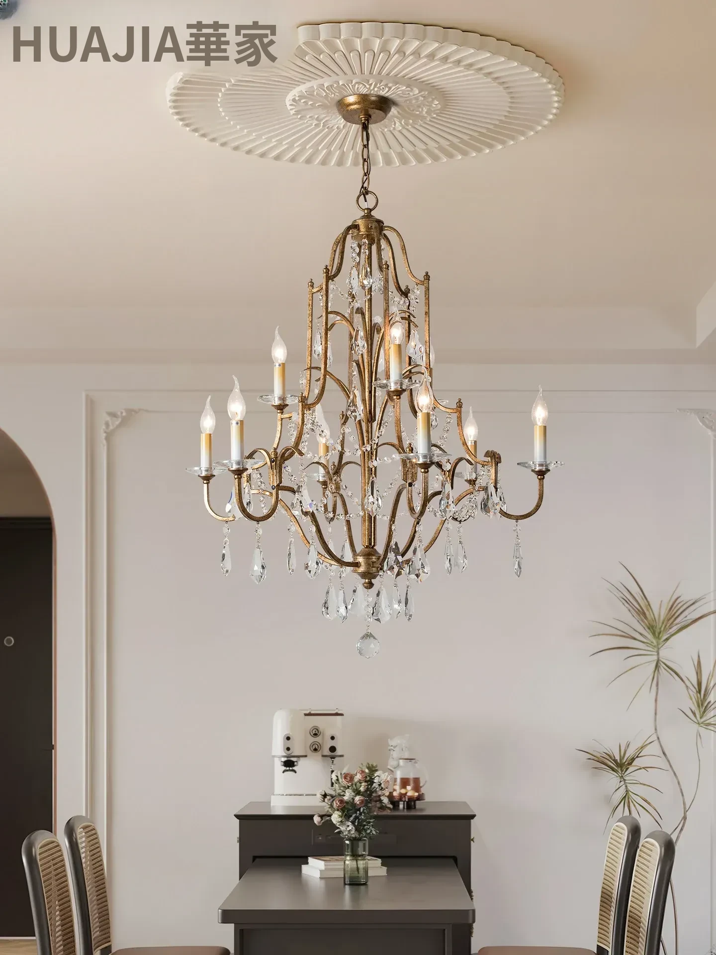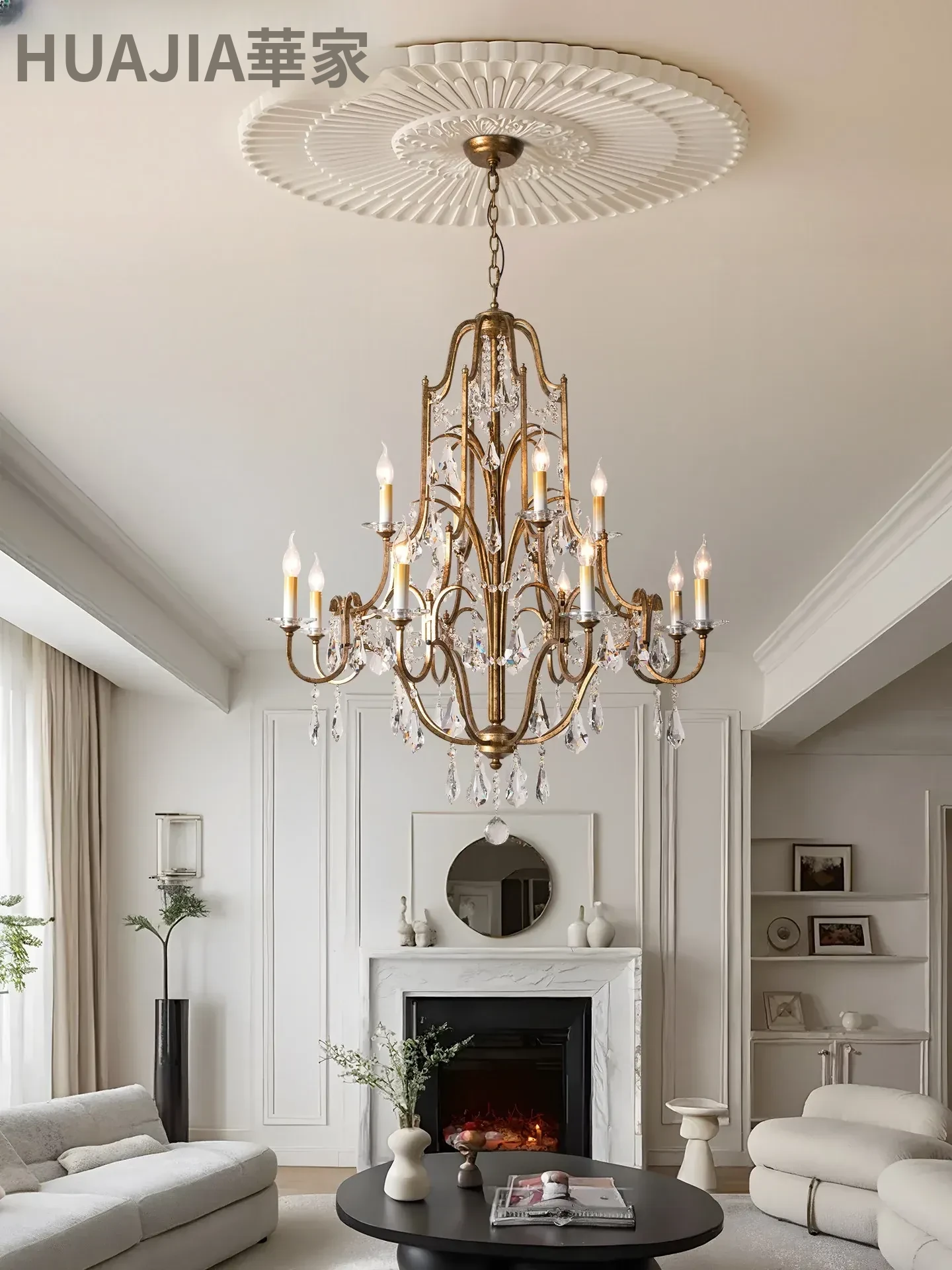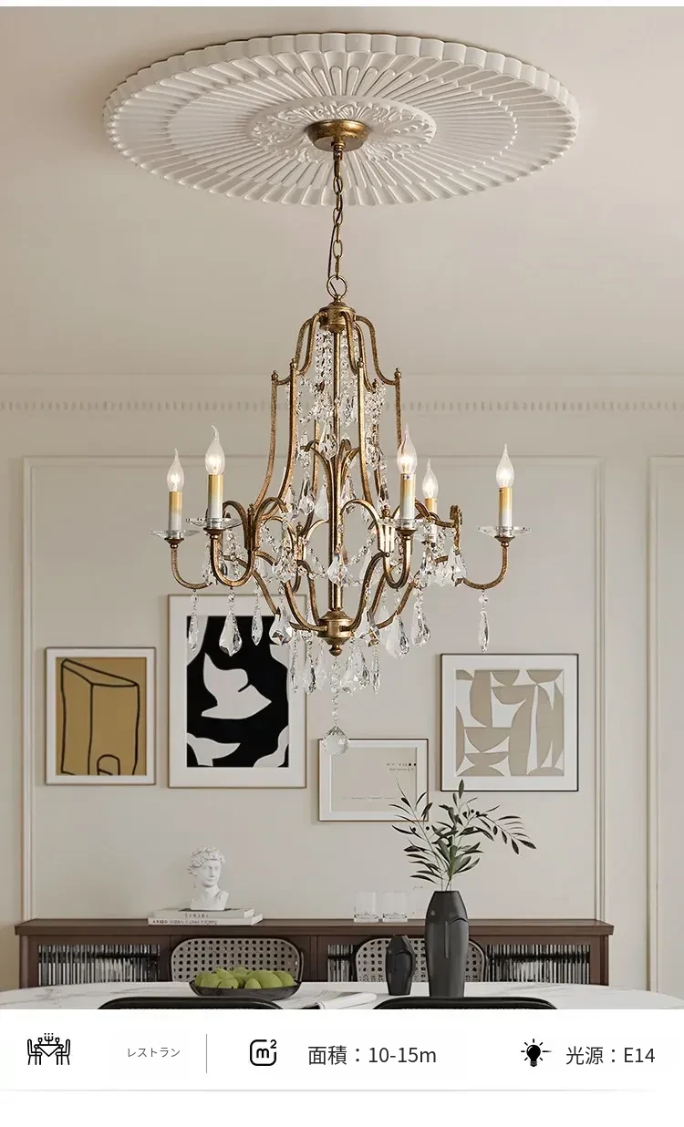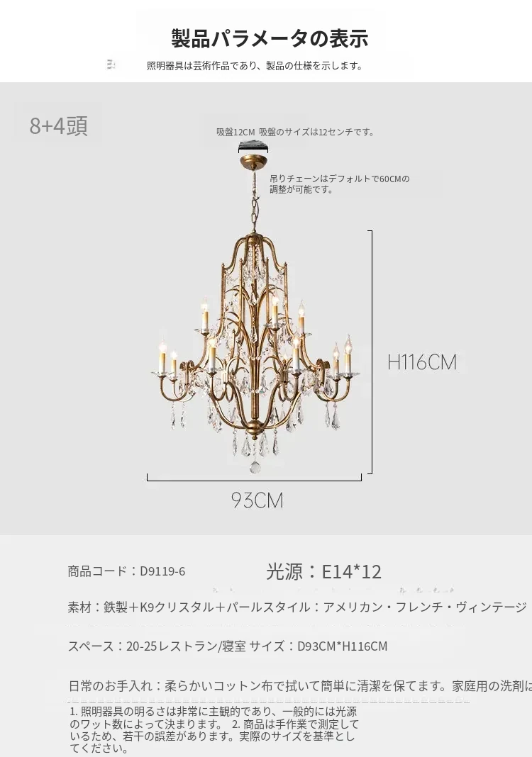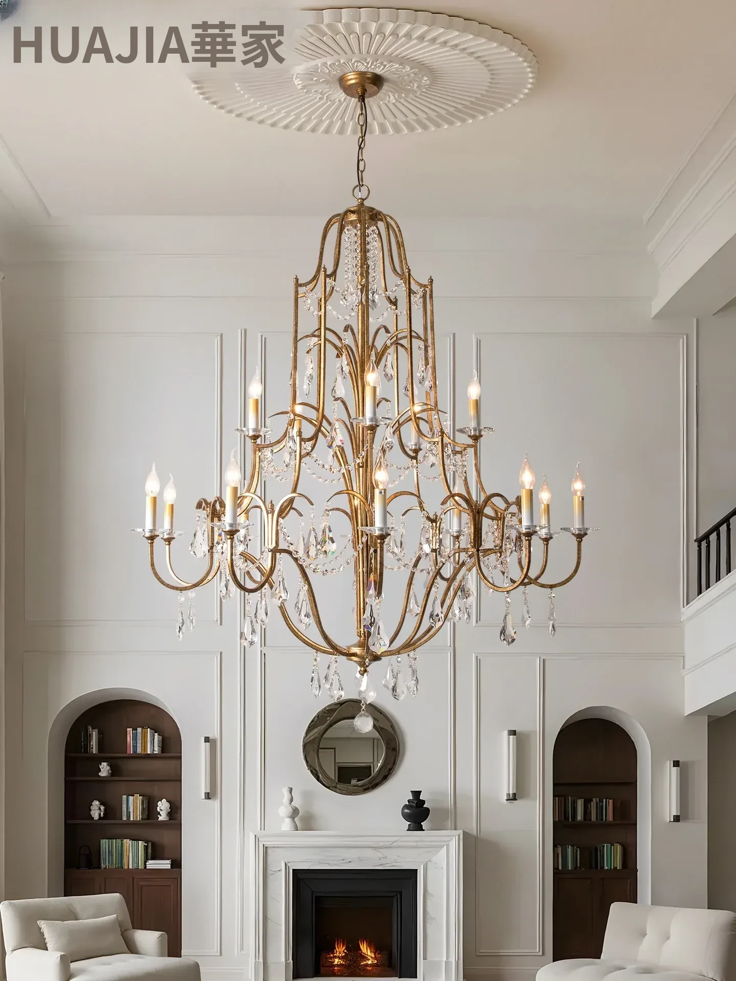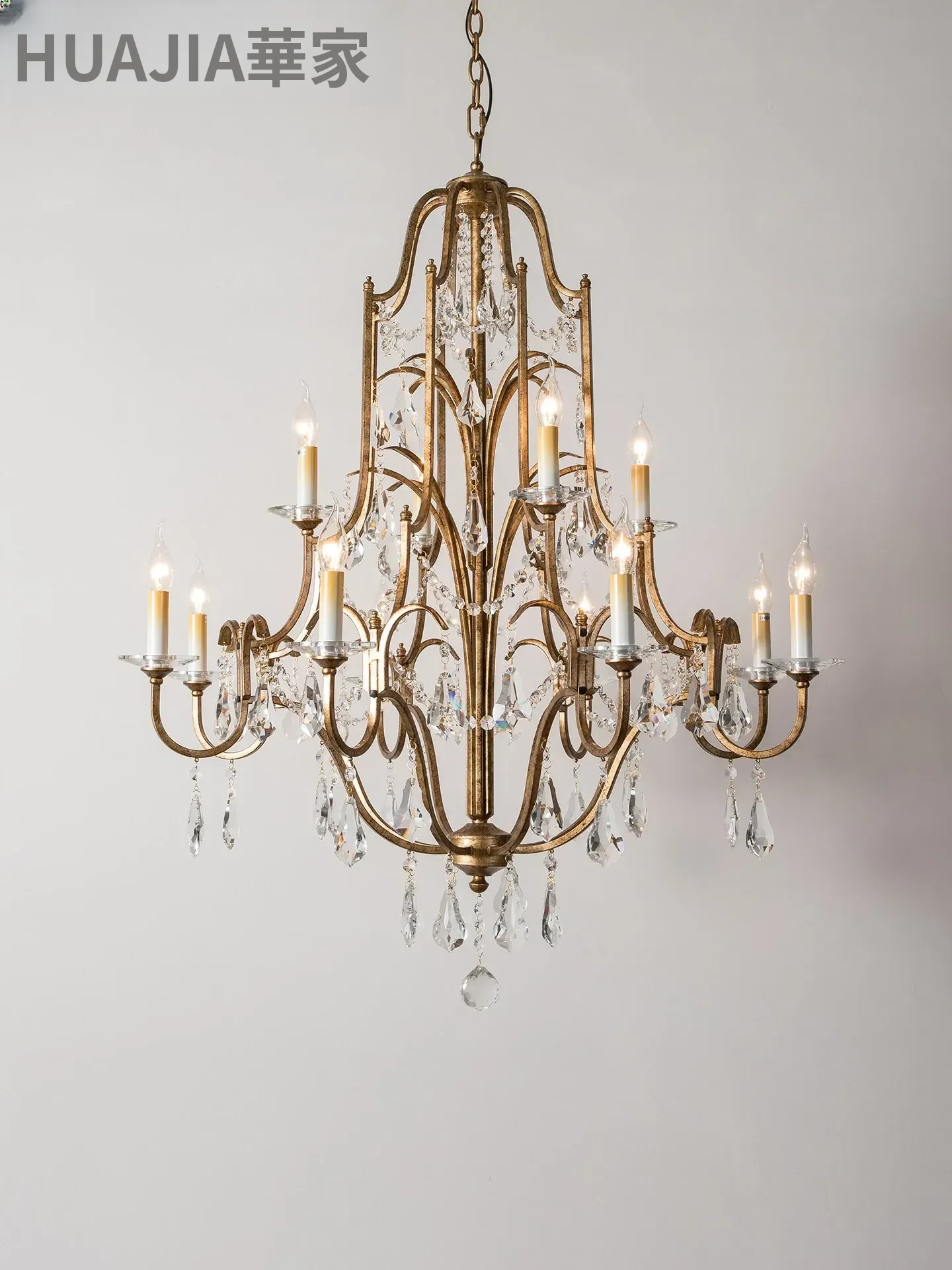 アメリカンスタイルの豪華な二段式シャンデリア - リビングルームや別荘、アパートに最適!高い天井に映えるクリスタルとフレンチキャンドルデザインの美しいステップライト。ダイニングや階段スペースにぴったりのアイテム!