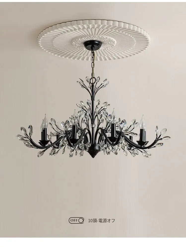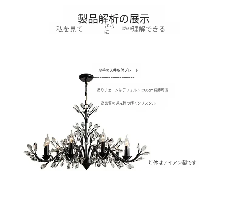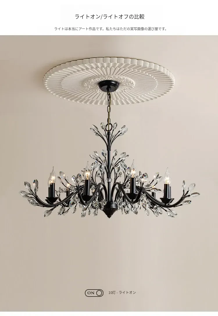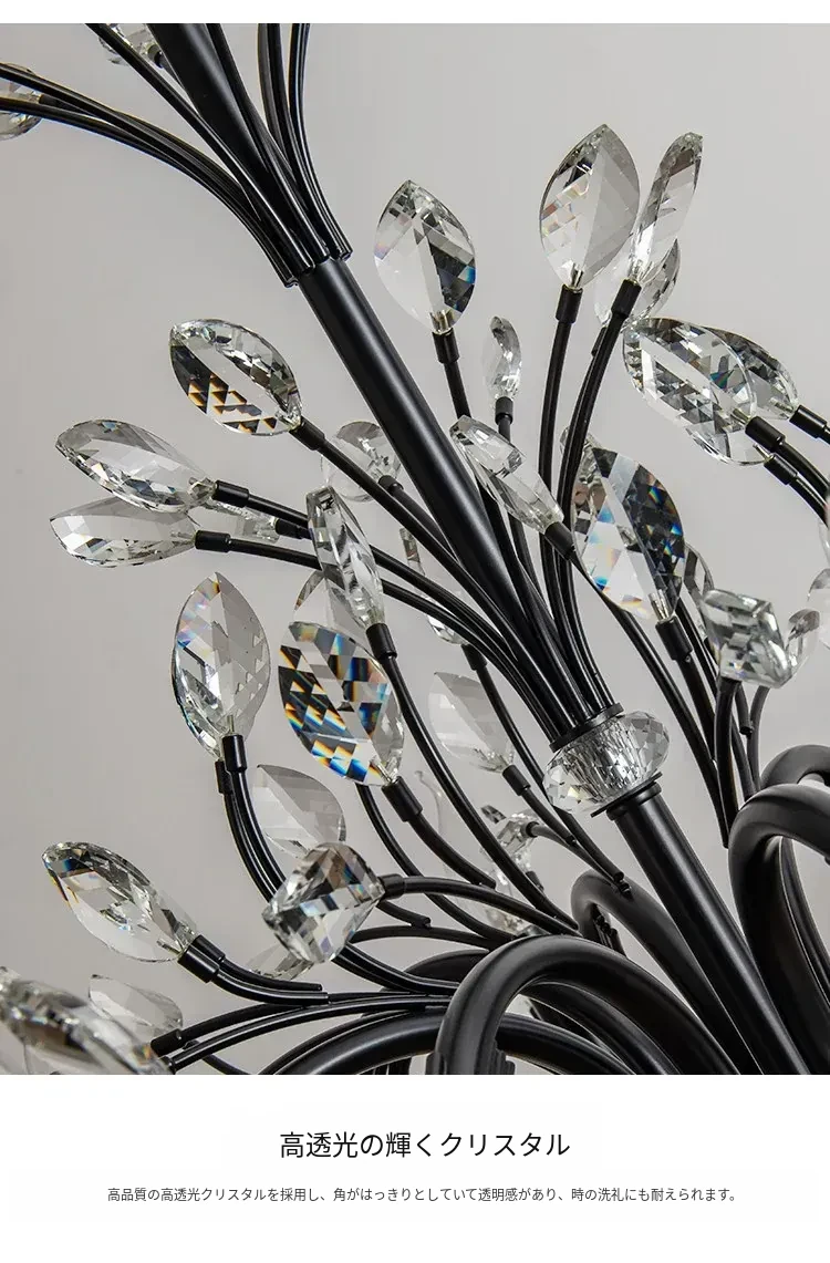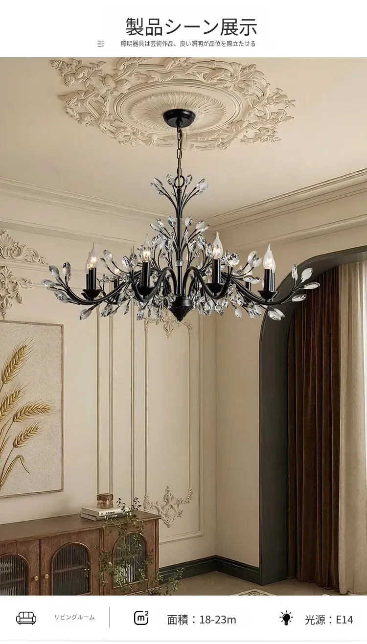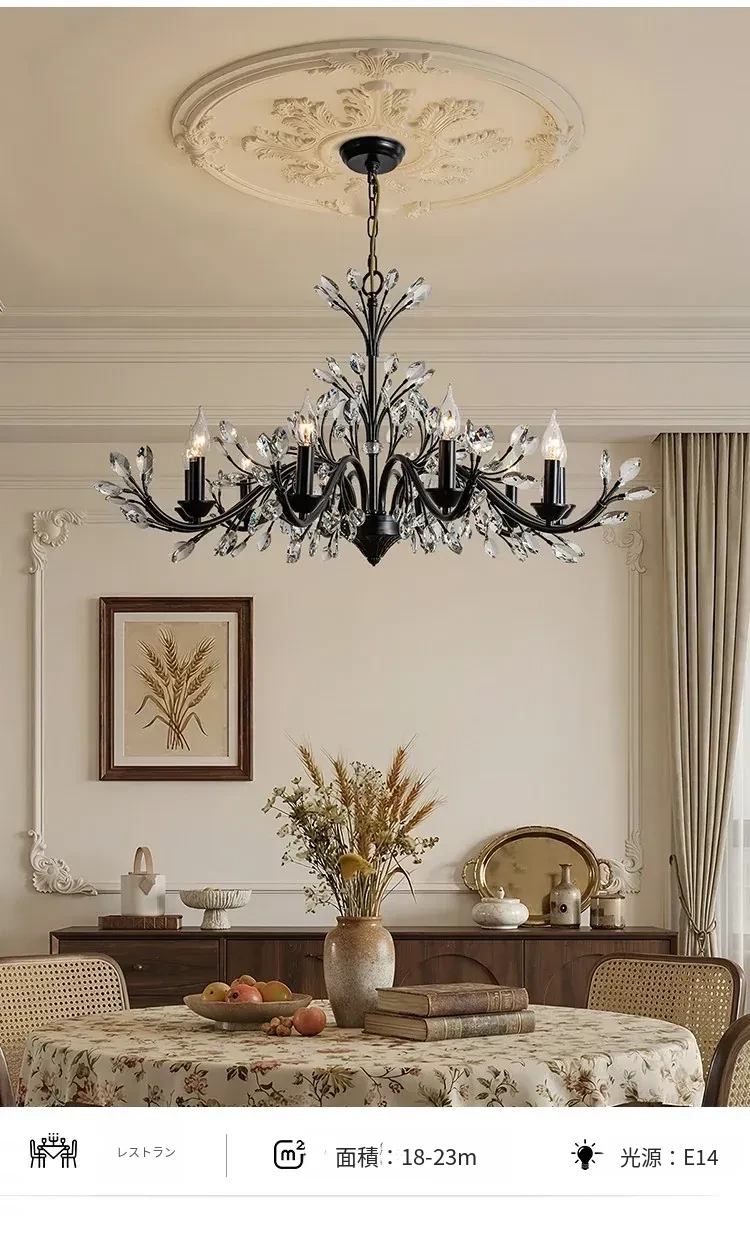 フレンチスタイルのシャンデリア、ラグジュアリーで高級感あふれるクリスタル製。シンプルでスタイリッシュなアメリカンデザイン。リビングや寝室、ダイニングにぴったりのムードを演出する照明。