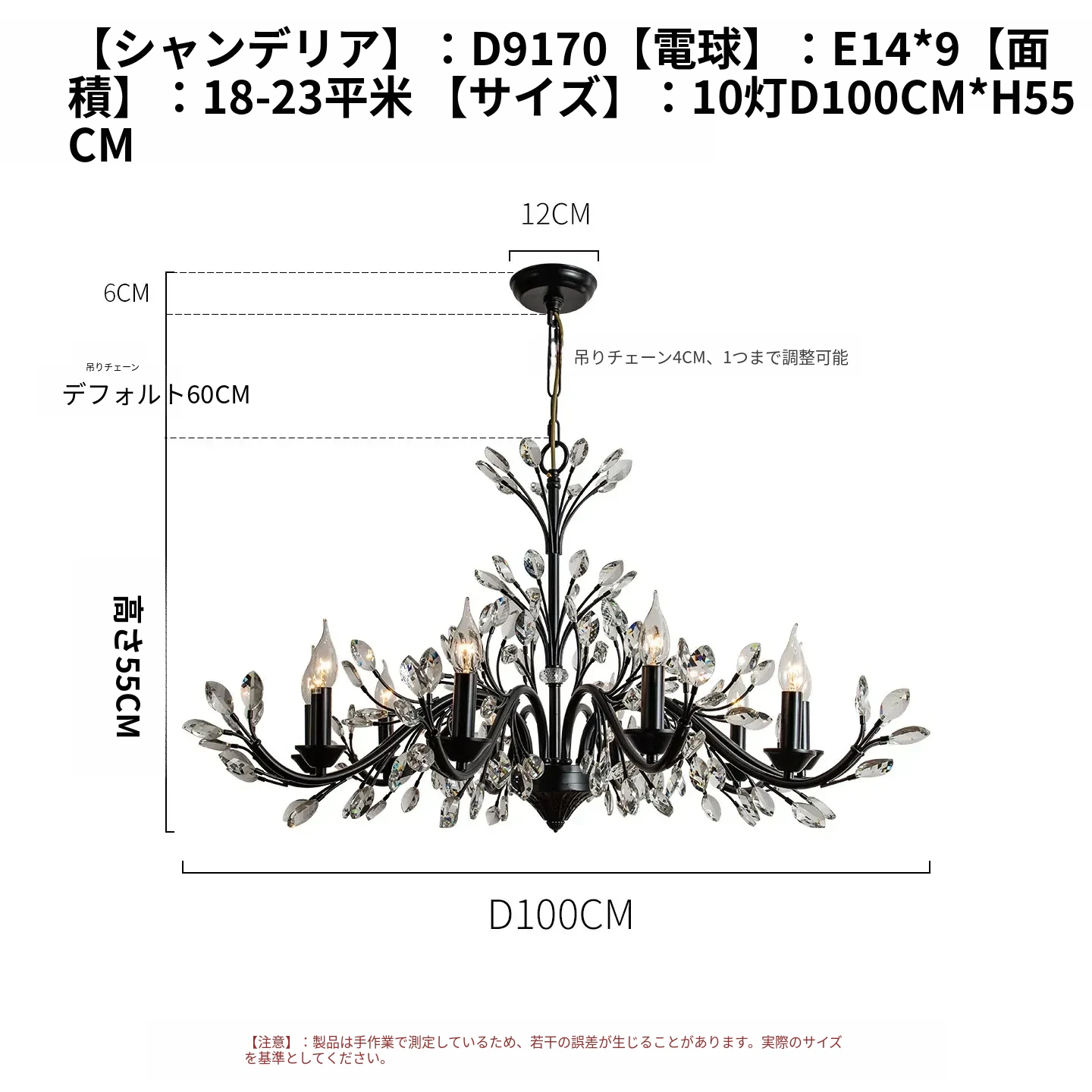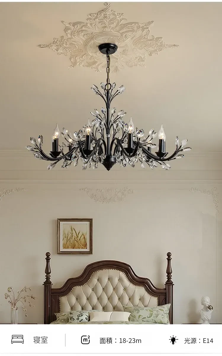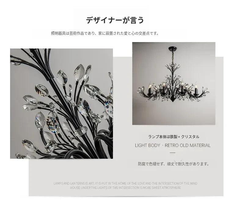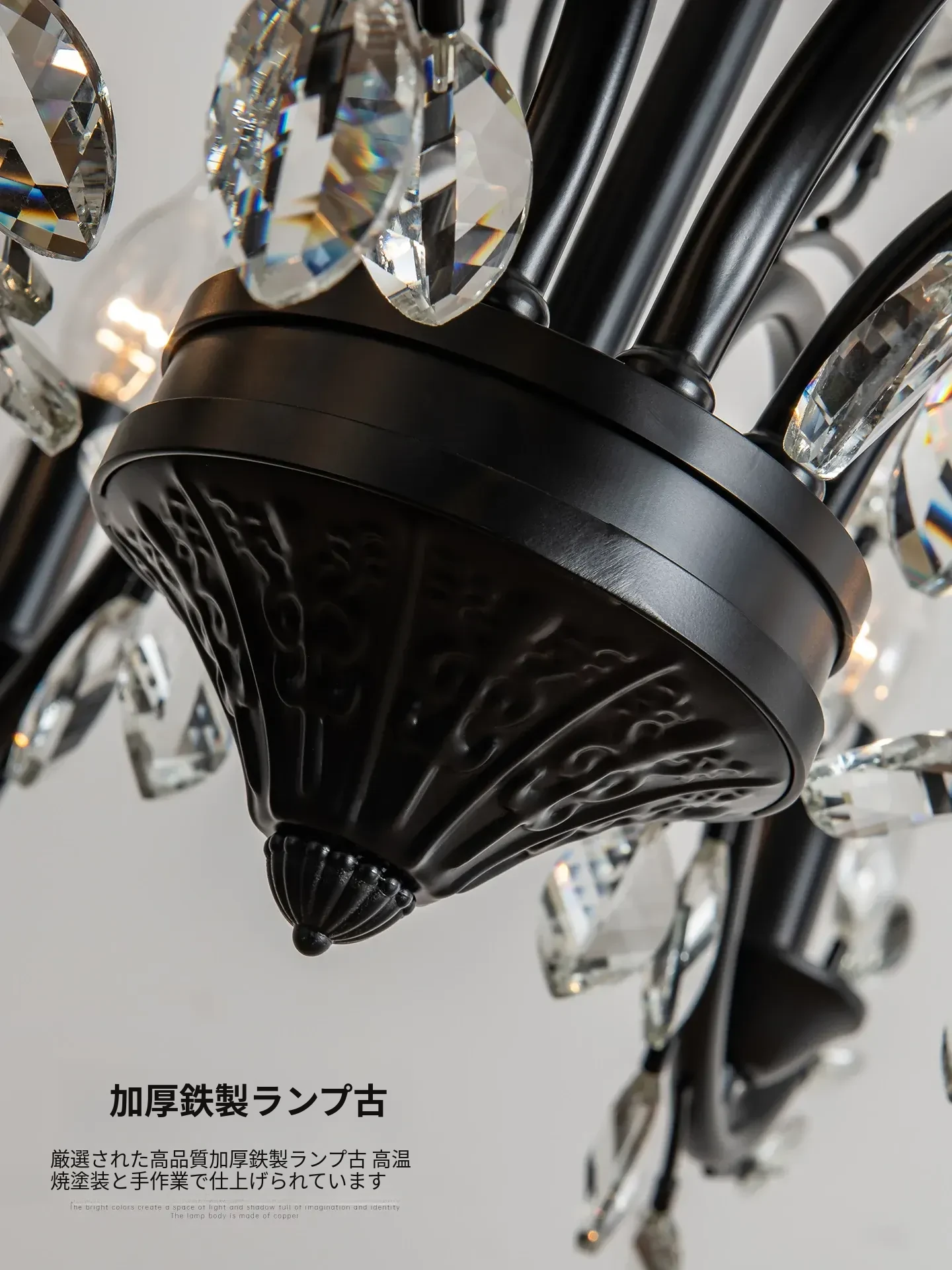 フレンチスタイルのシャンデリア、ラグジュアリーで高級感あふれるクリスタル製。シンプルでスタイリッシュなアメリカンデザイン。リビングや寝室、ダイニングにぴったりのムードを演出する照明。