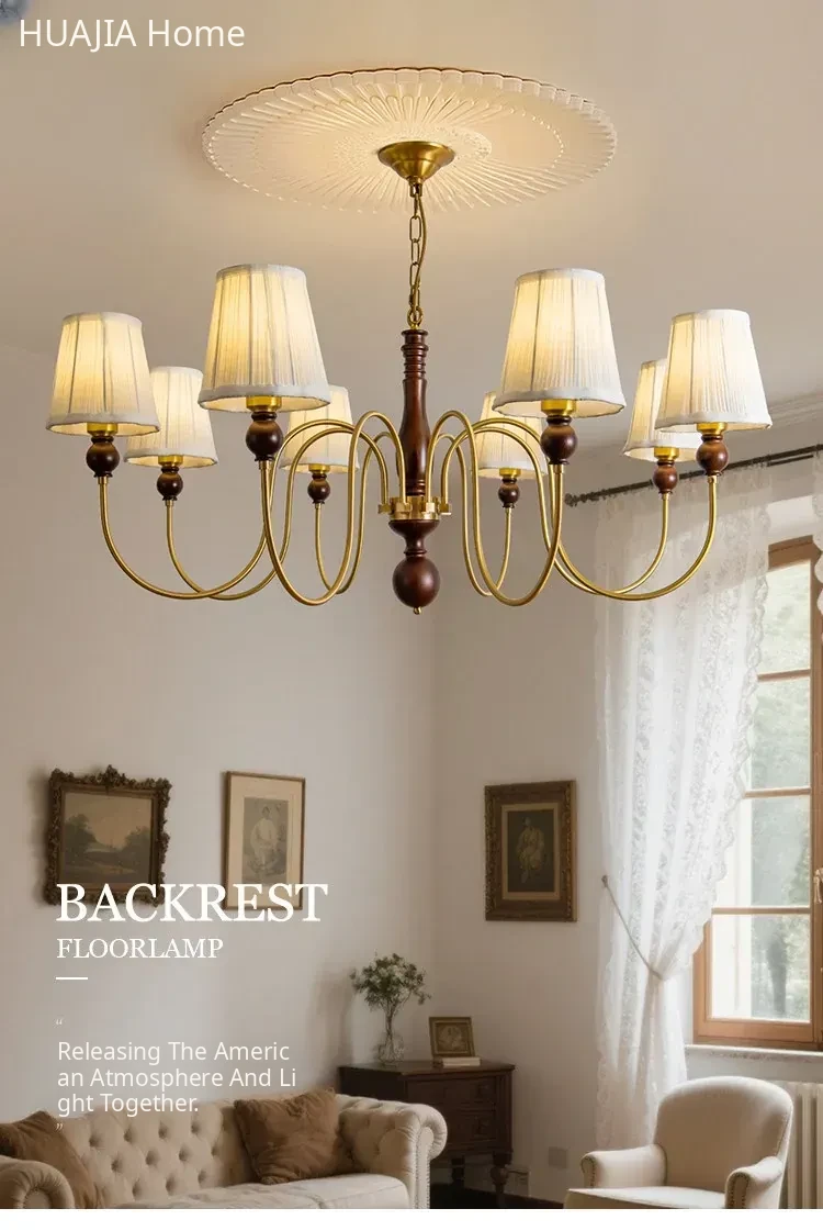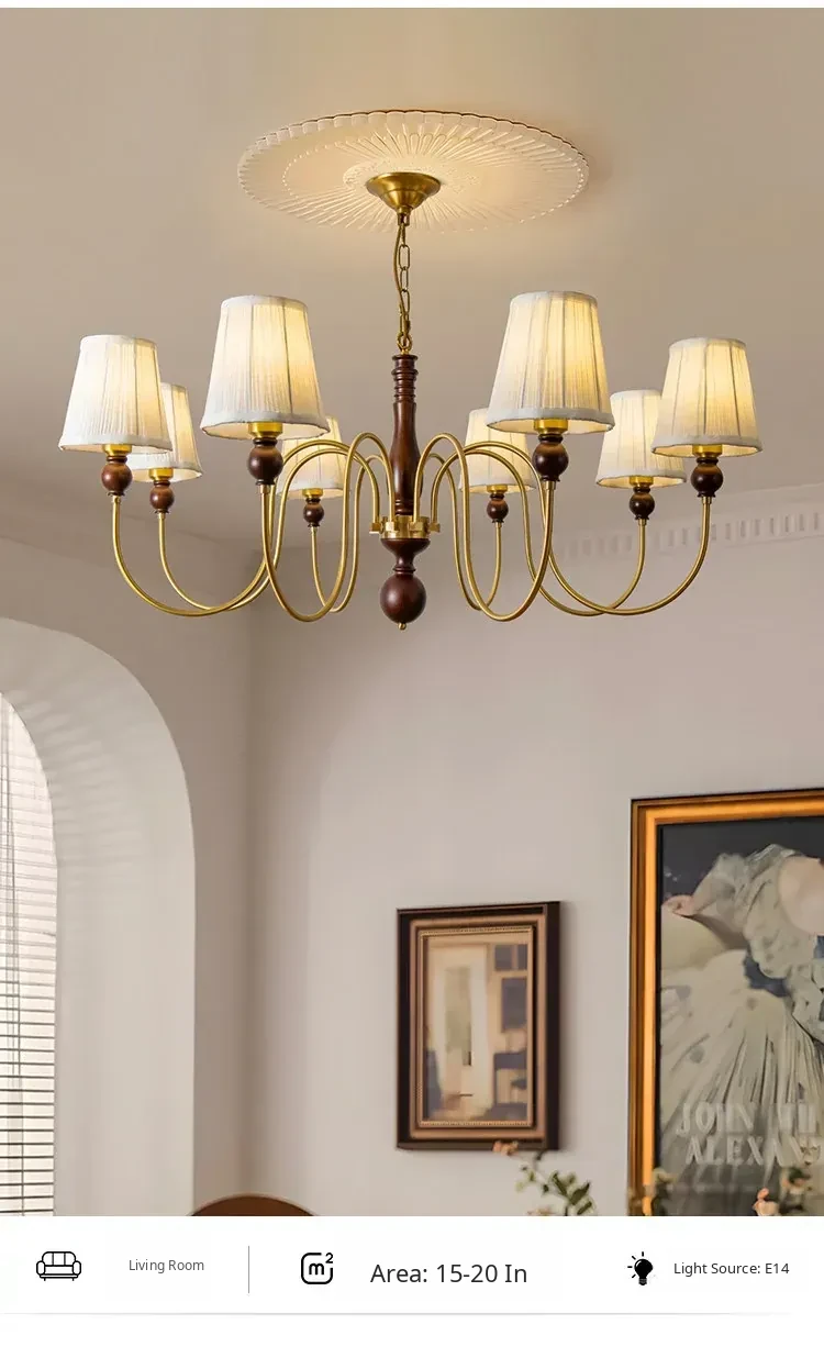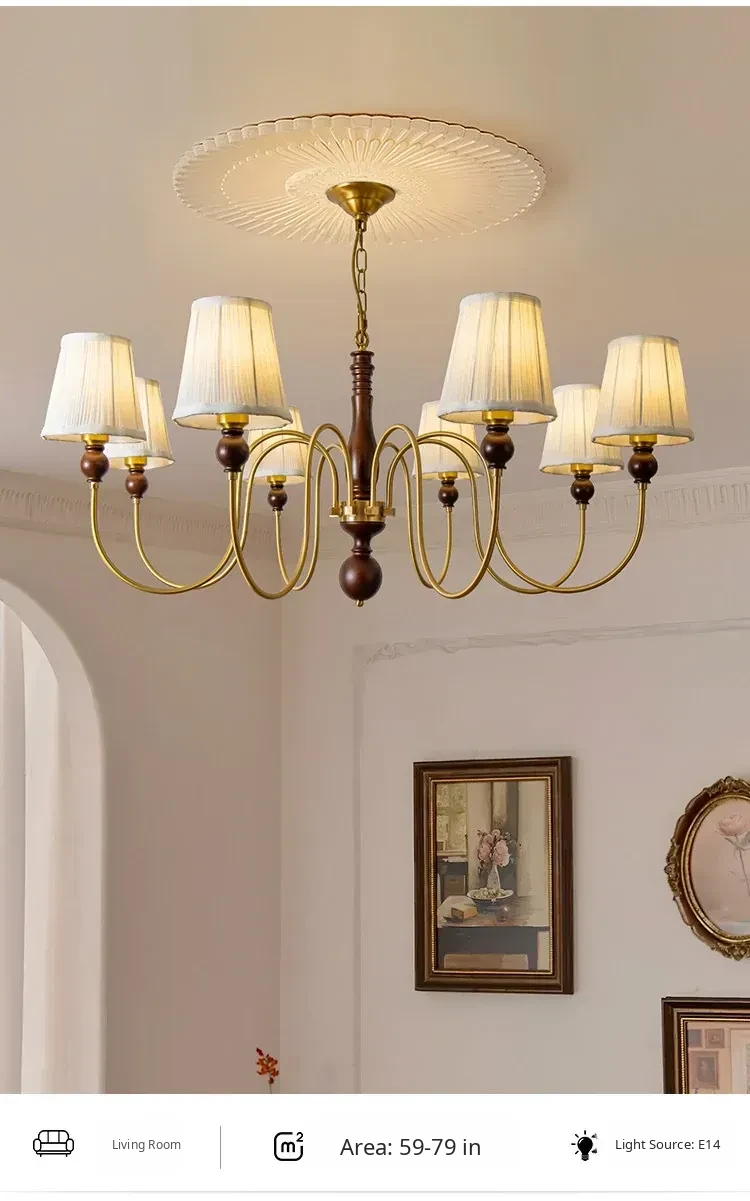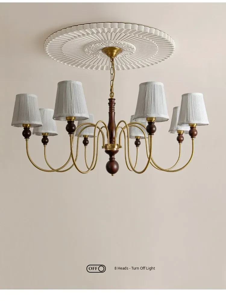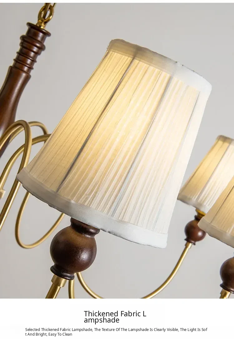 French Vintage Fabric Chandelier - American Retro Solid Wood Atmosphere Lamp for Living Room, Bedroom, and Dining Room