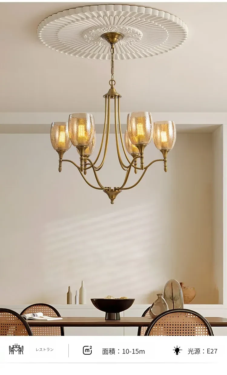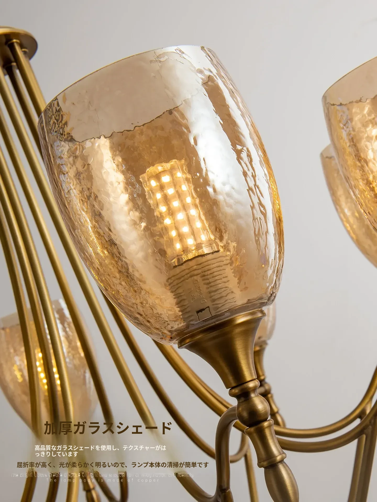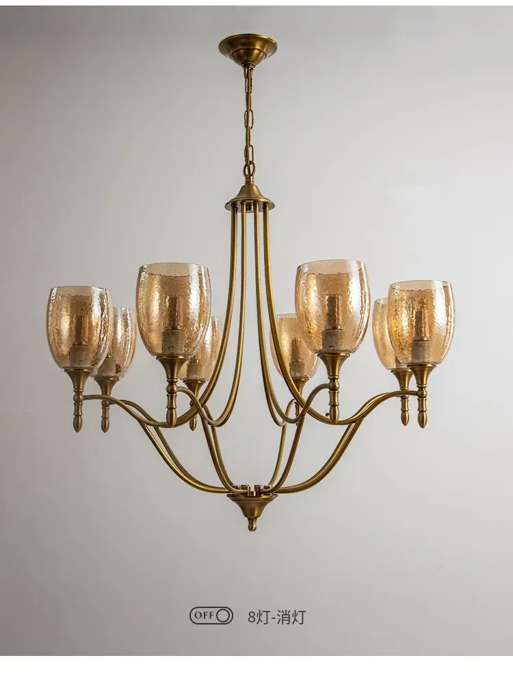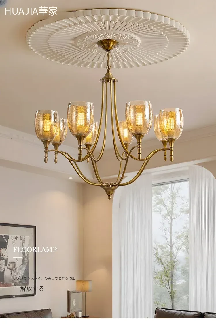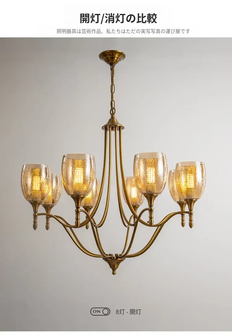 フレンチアンティークスタイルのリビングルーム用シャンデリア、アメリカンレトロ全銅製、高級感あふれる琥珀色ガラスのダイニング&ベッドルームライト。洗練されたデザインで、空間を華やかに演出します!