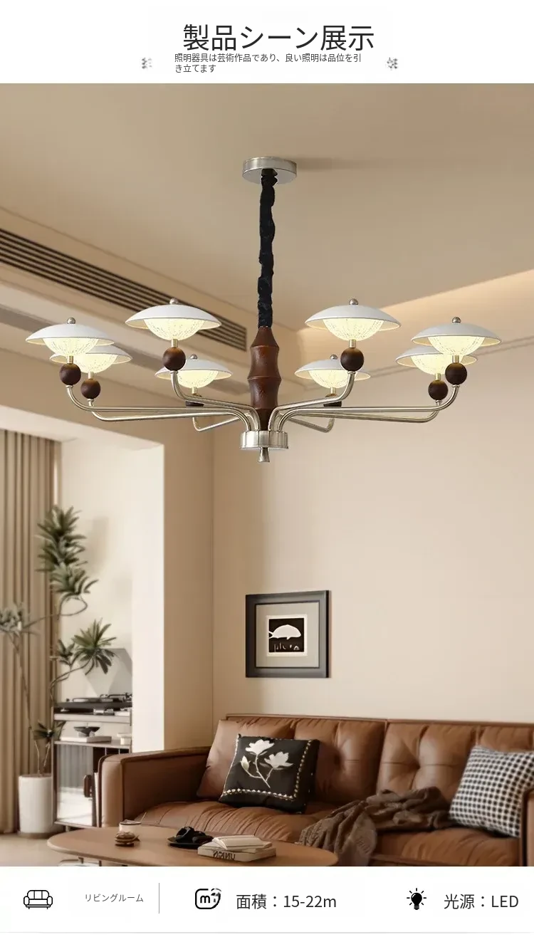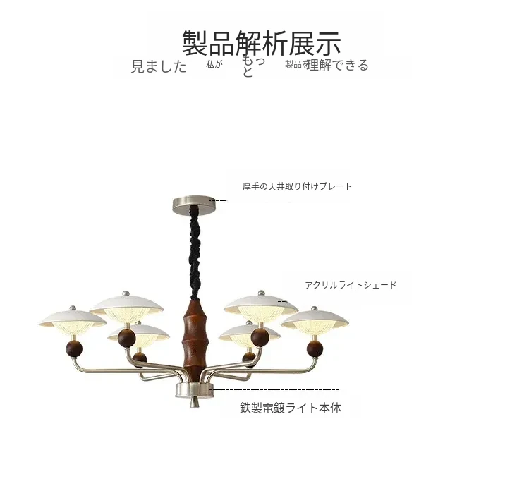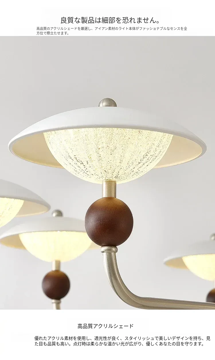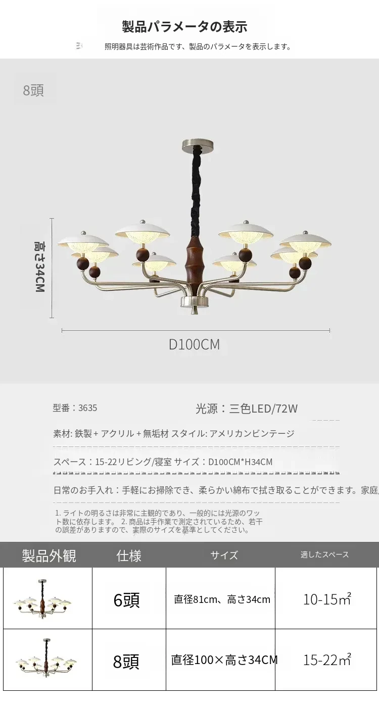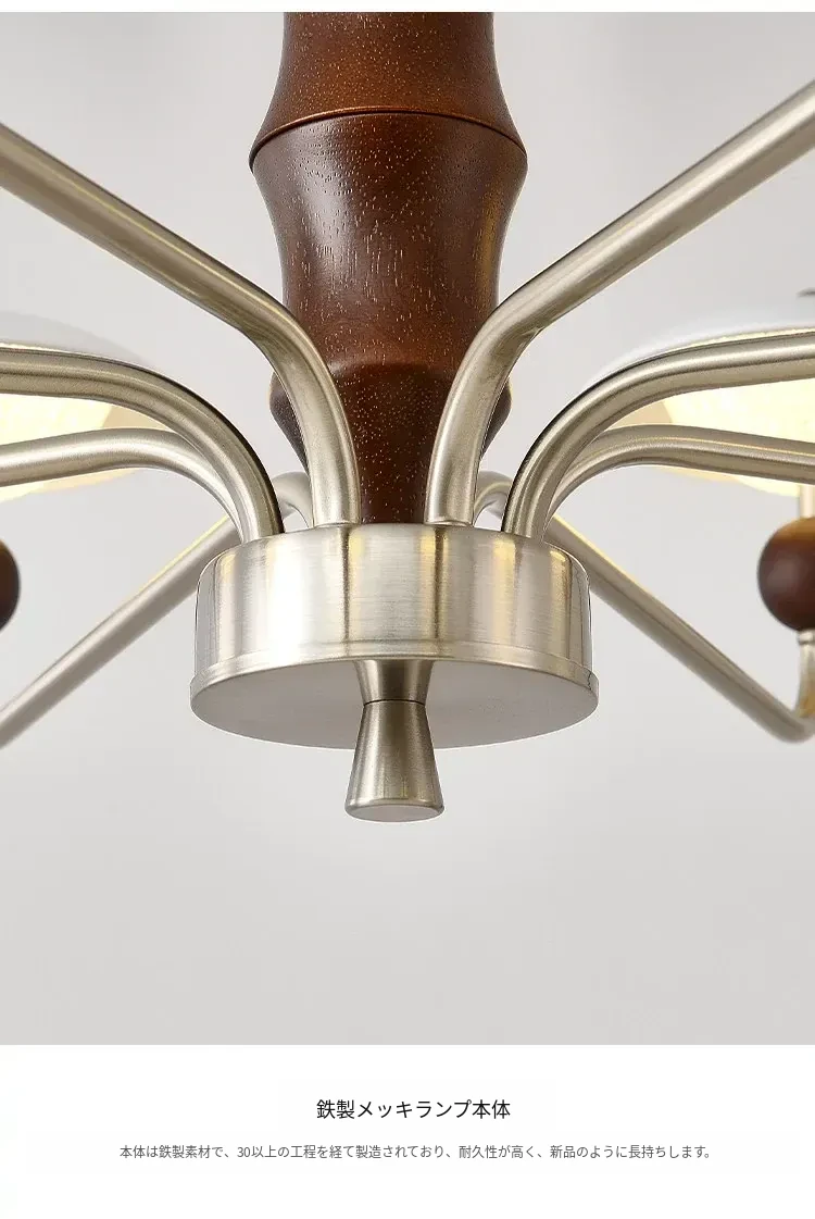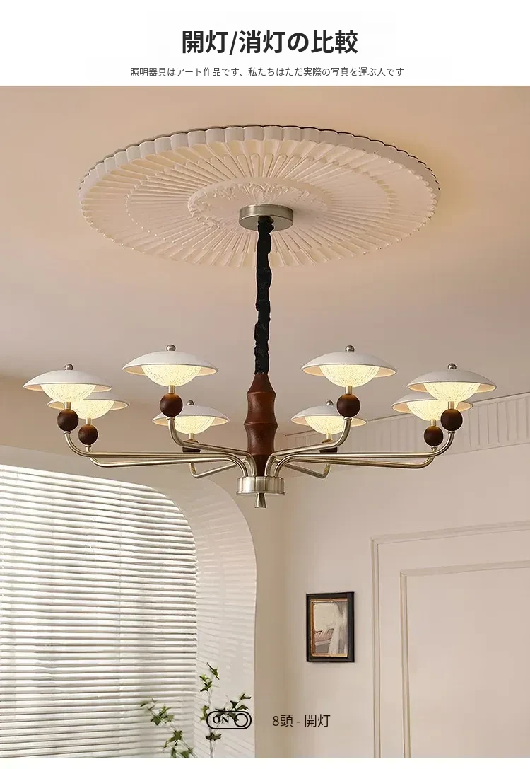 フレンチヴィンテージ風シャンデリア - レトロなクルミの木製、クリームカラーのLEDライトで目にも優しい!リビングや寝室、ダイニングにぴったりの魅力的な照明器具。