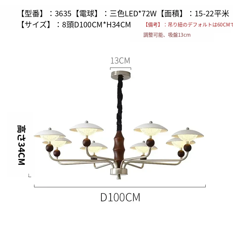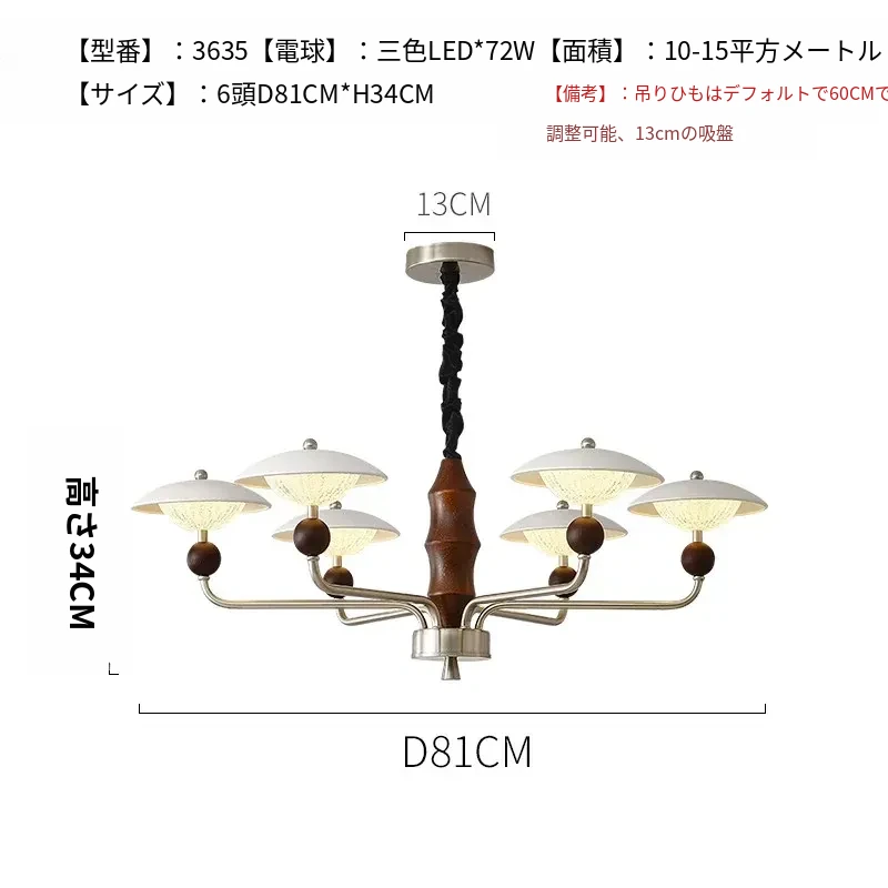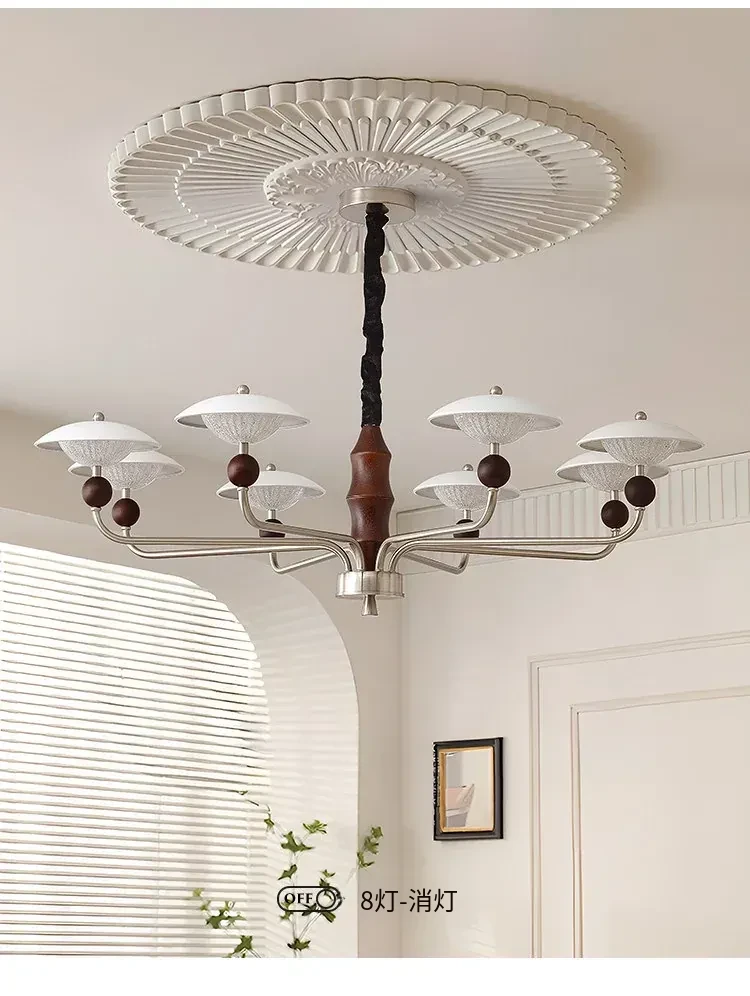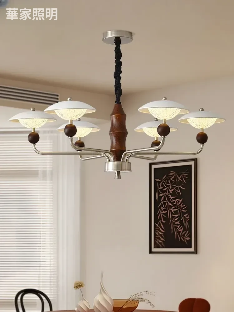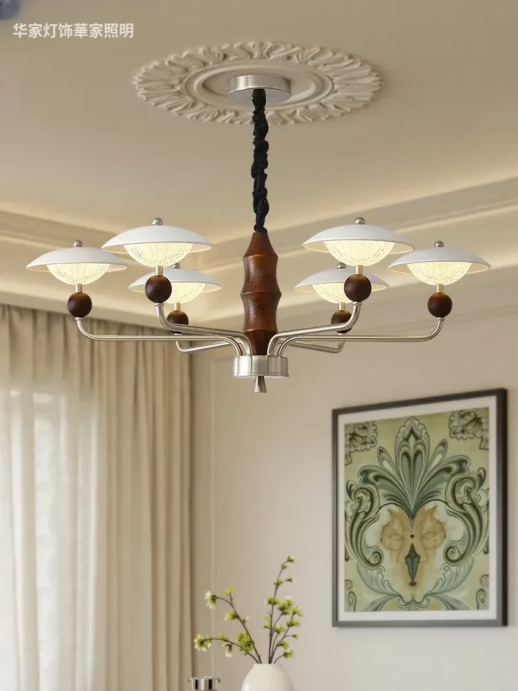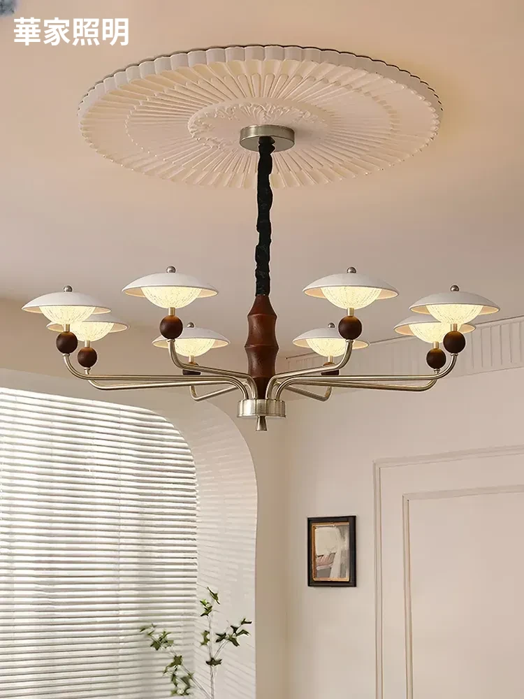 フレンチヴィンテージ風シャンデリア - レトロなクルミの木製、クリームカラーのLEDライトで目にも優しい!リビングや寝室、ダイニングにぴったりの魅力的な照明器具。