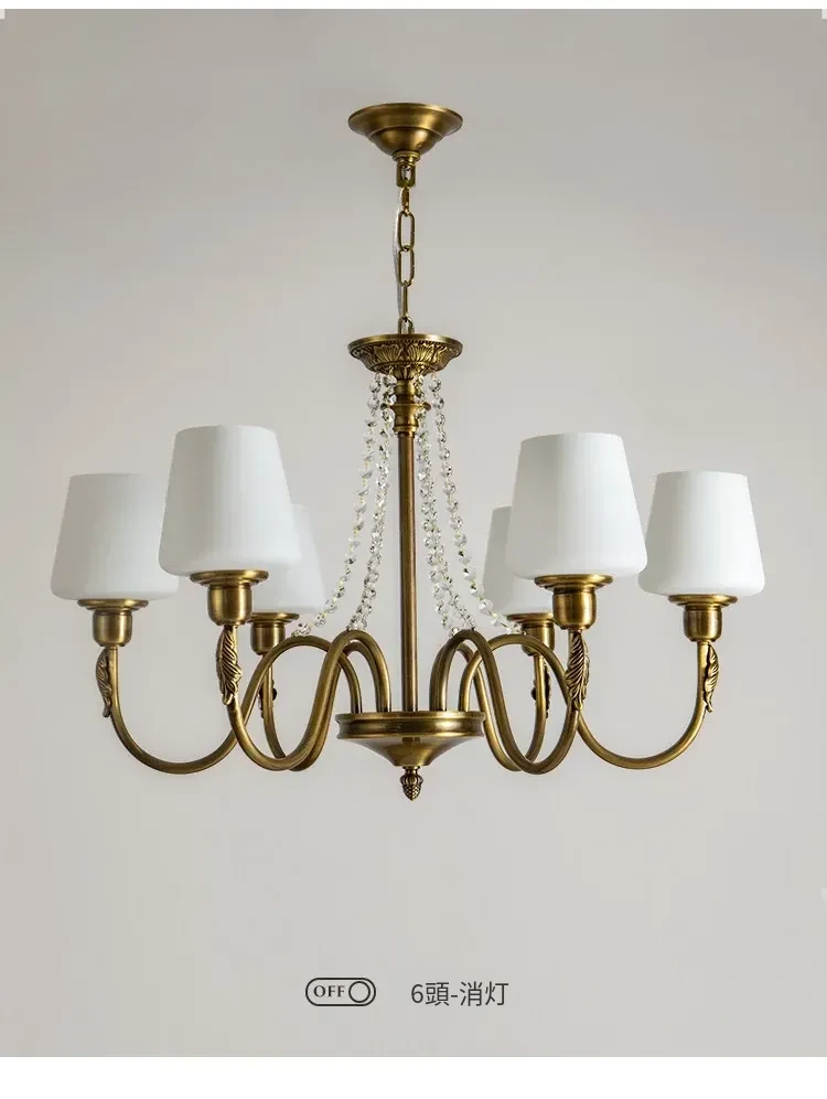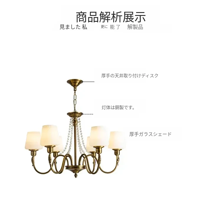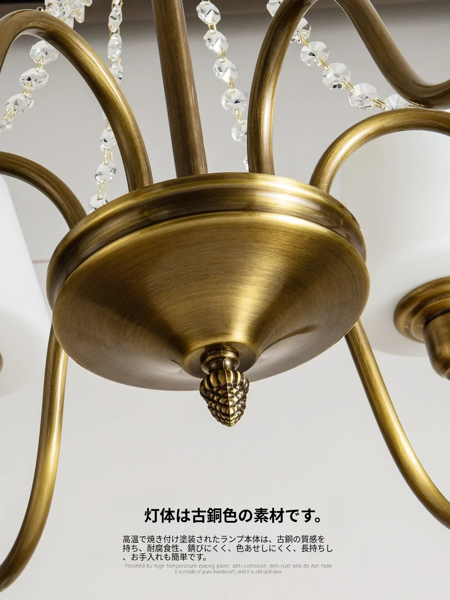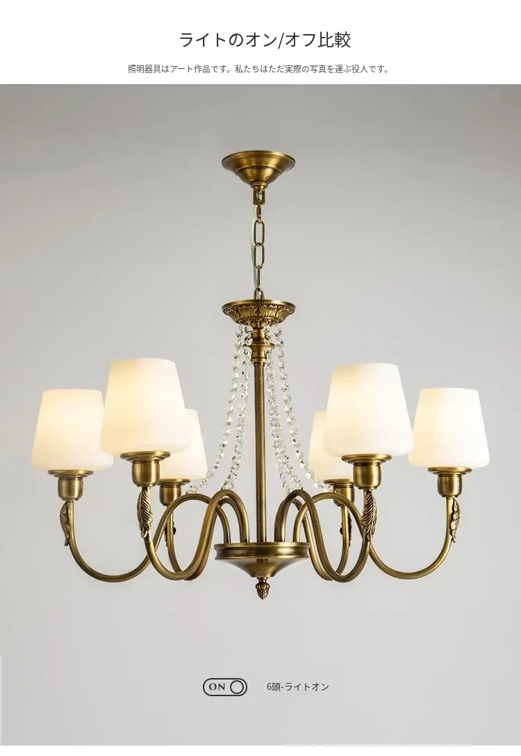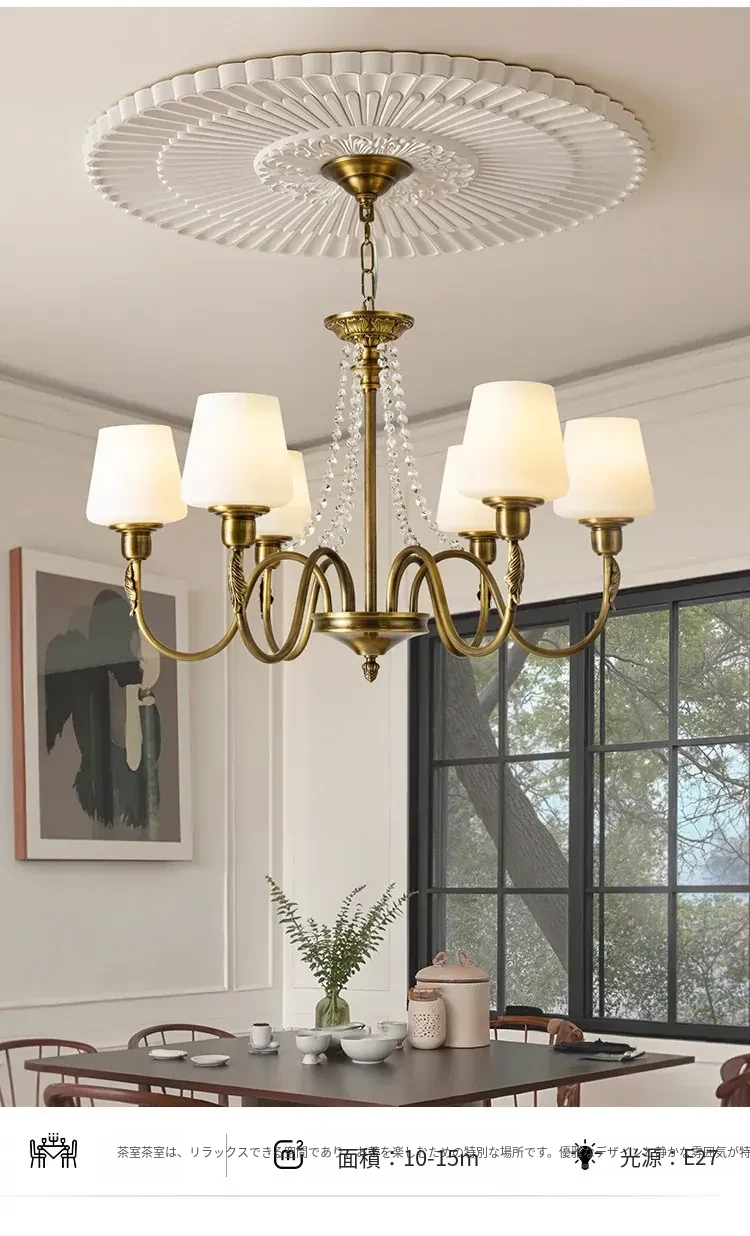 フランス風アンティークスタイルのリビングルーム用シャンデリア。アメリカンレトロなミルクホワイトガラスの吊り灯。全銅製で、雰囲気抜群の寝室やダイニングに最適な照明器具です。