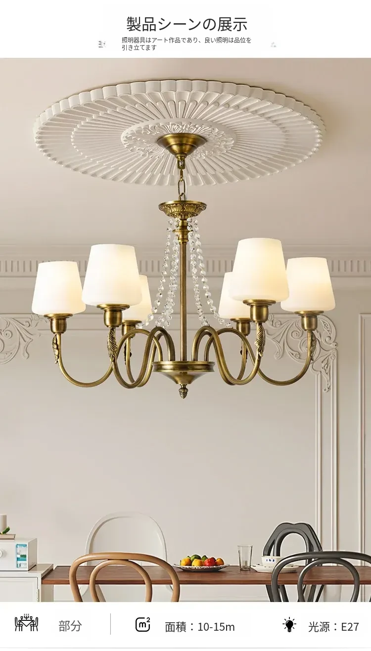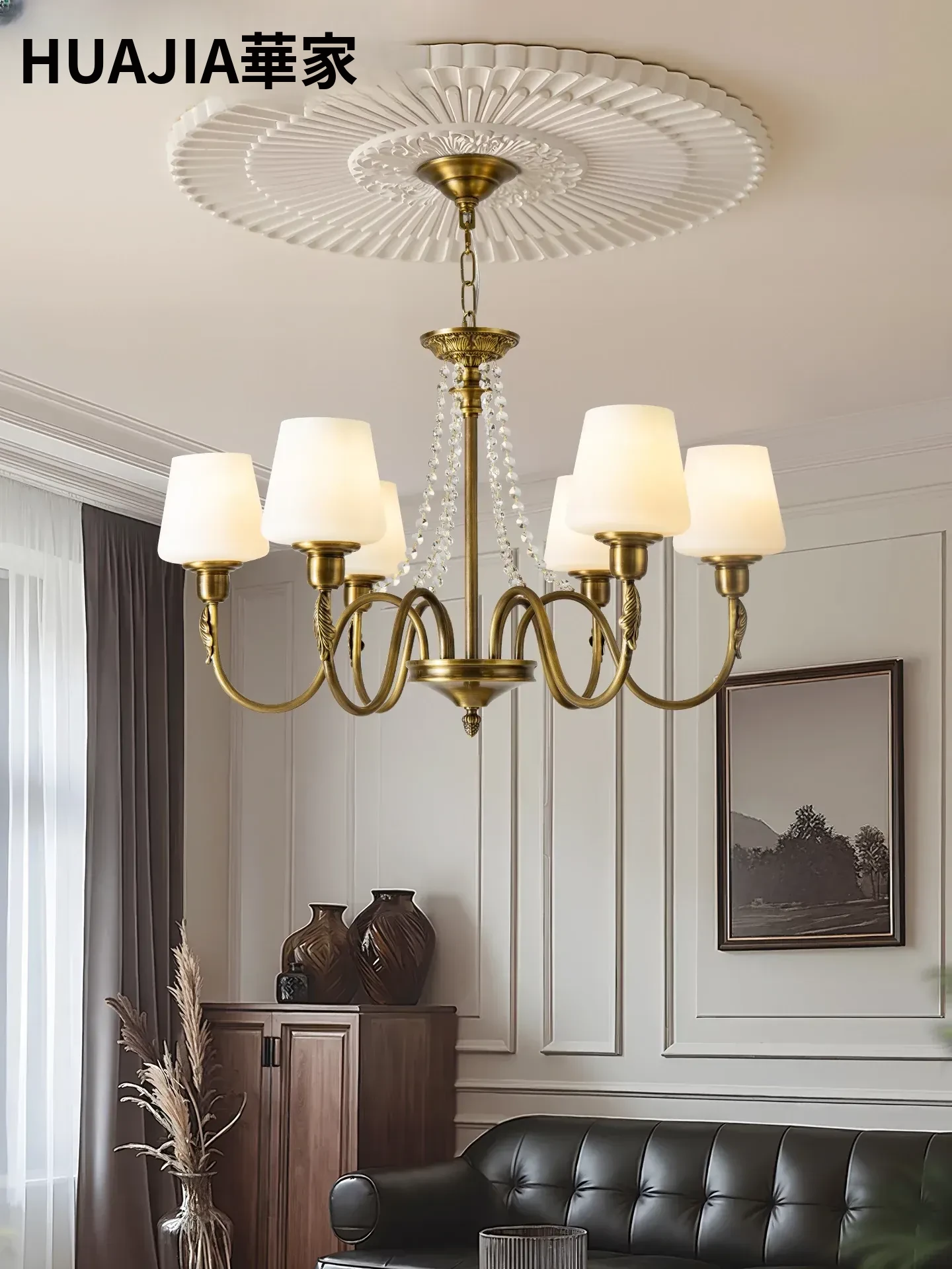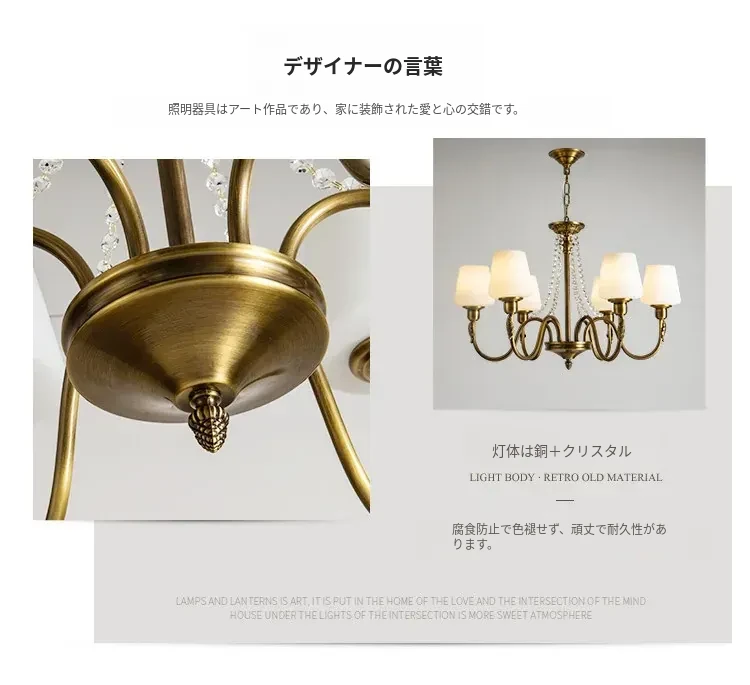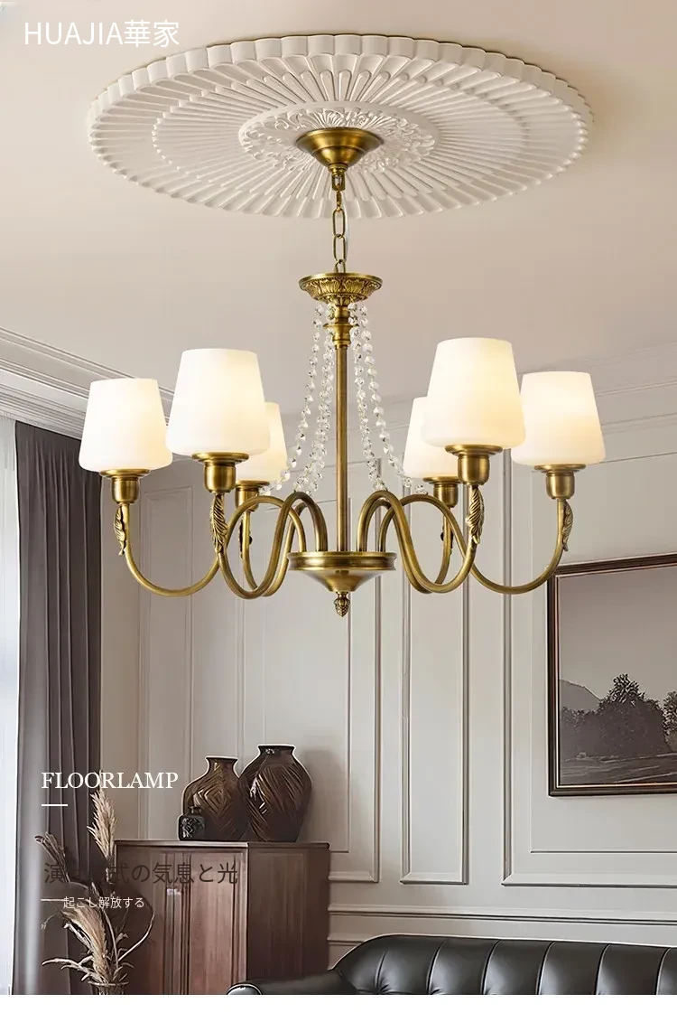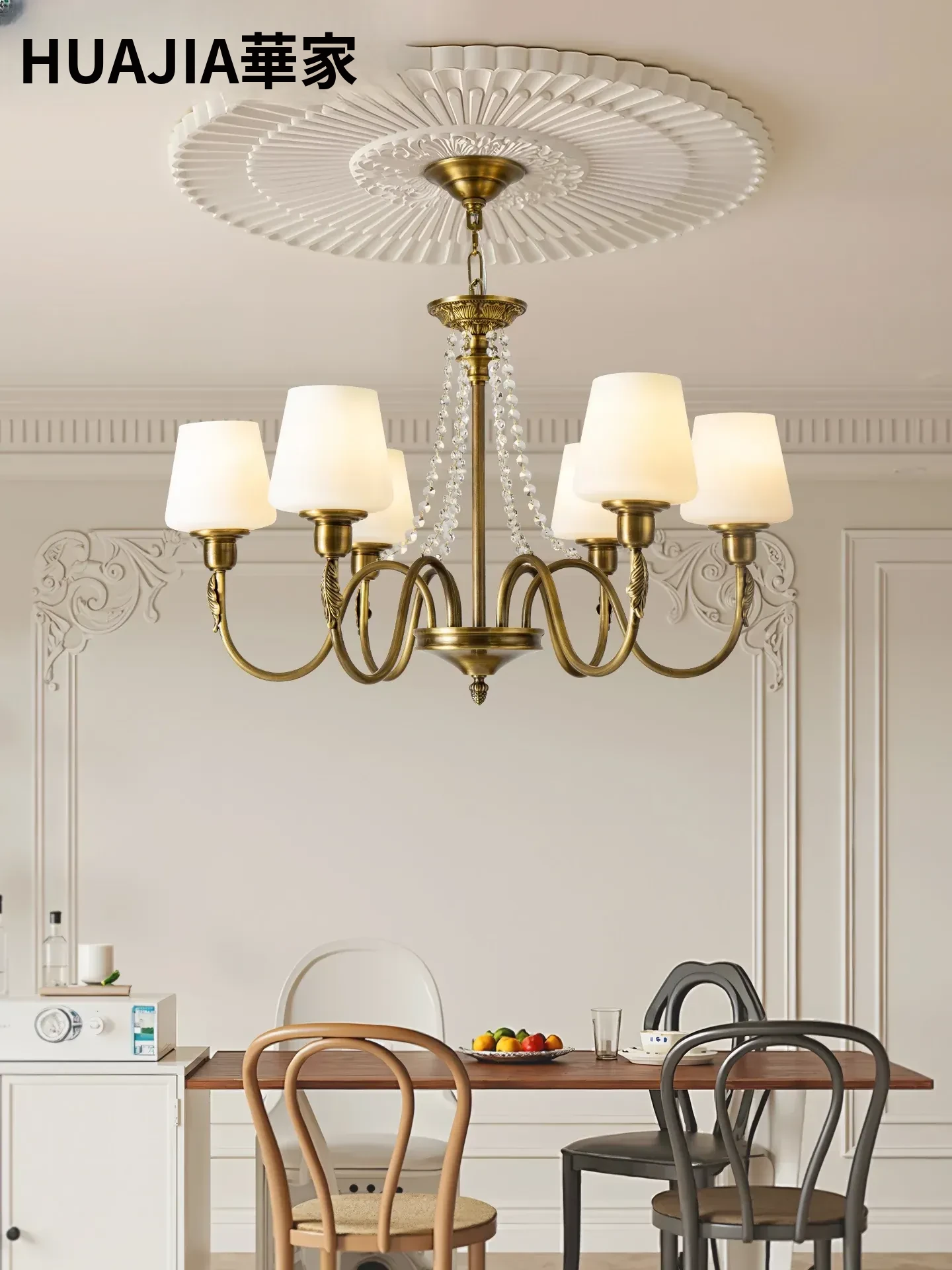フランス風アンティークスタイルのリビングルーム用シャンデリア。アメリカンレトロなミルクホワイトガラスの吊り灯。全銅製で、雰囲気抜群の寝室やダイニングに最適な照明器具です。