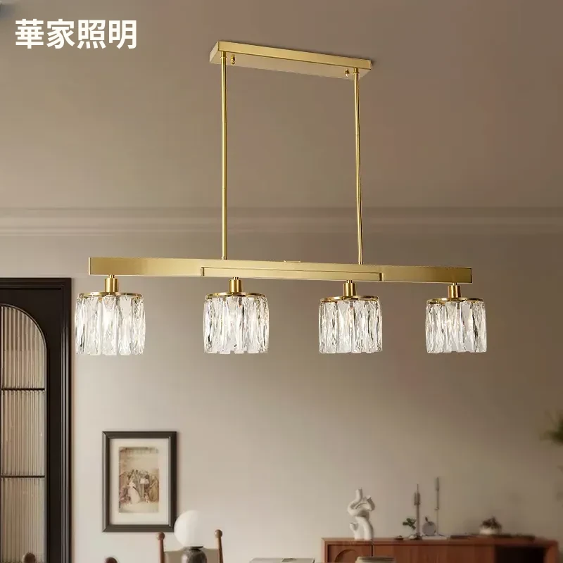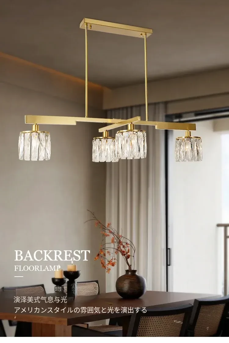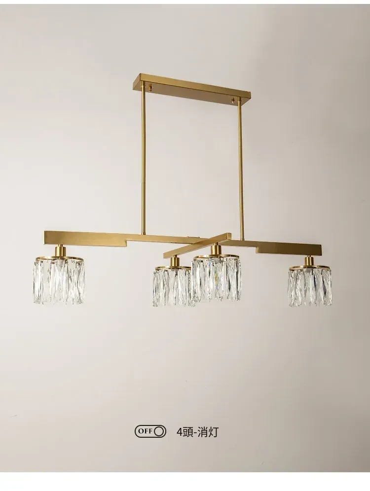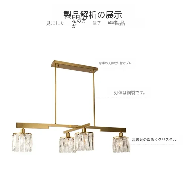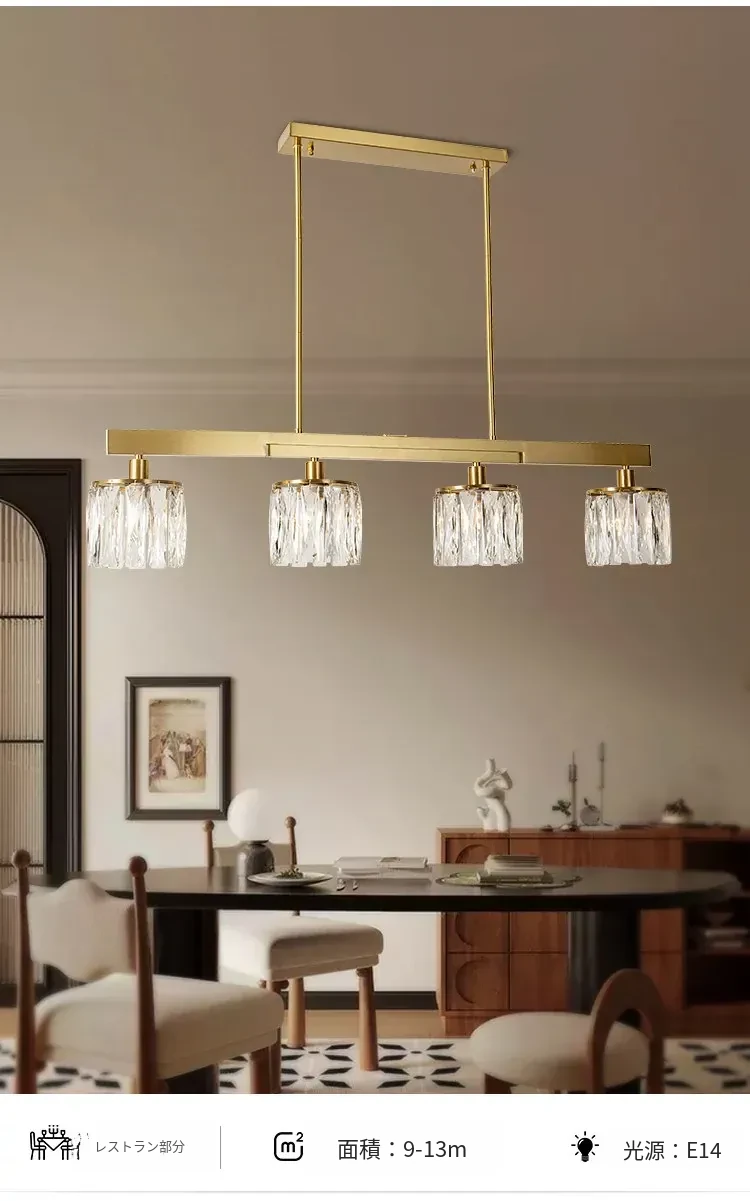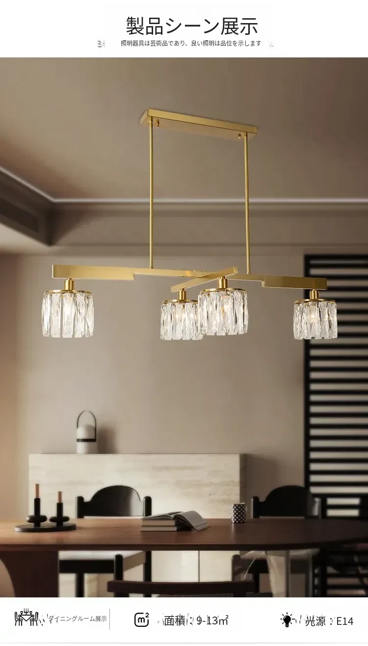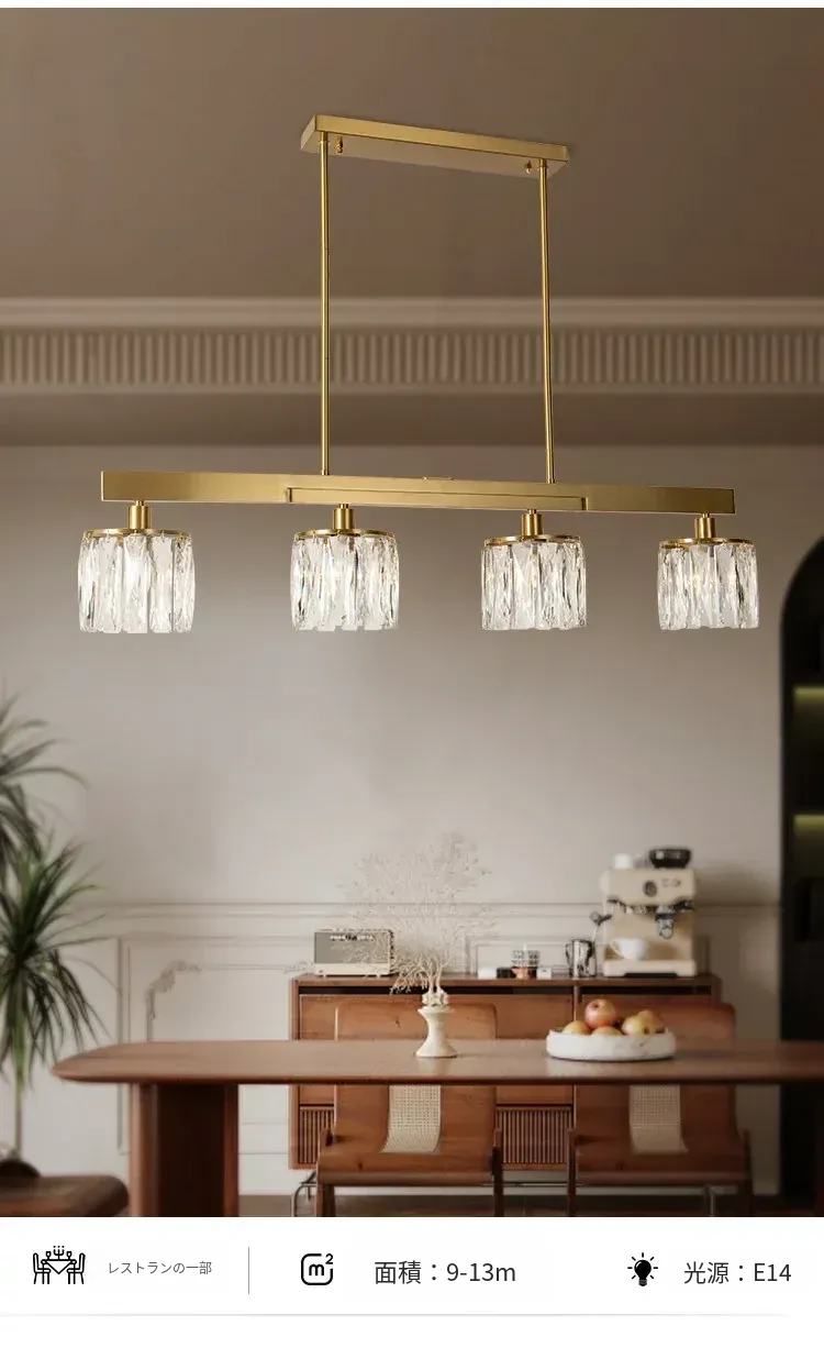 アメリカンスタイル全銅製レストラン用ペンダントライト - シンプルでエレガントな長方形デザイン、ダイニングテーブルに最適!高級感あふれるクリスタルの一字型バーライトで、あなたの食卓を華やかに演出します。