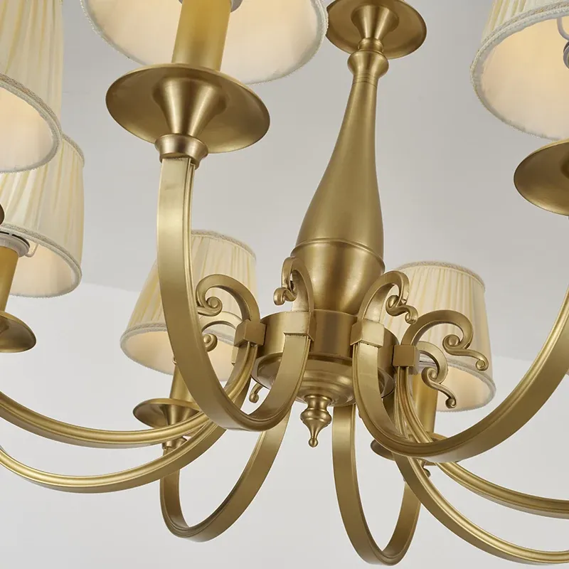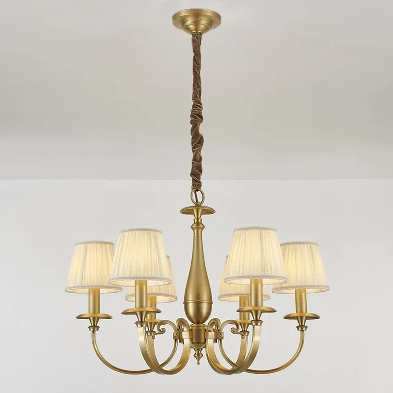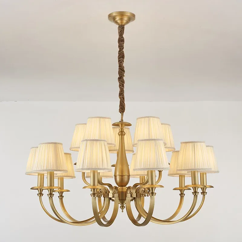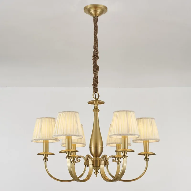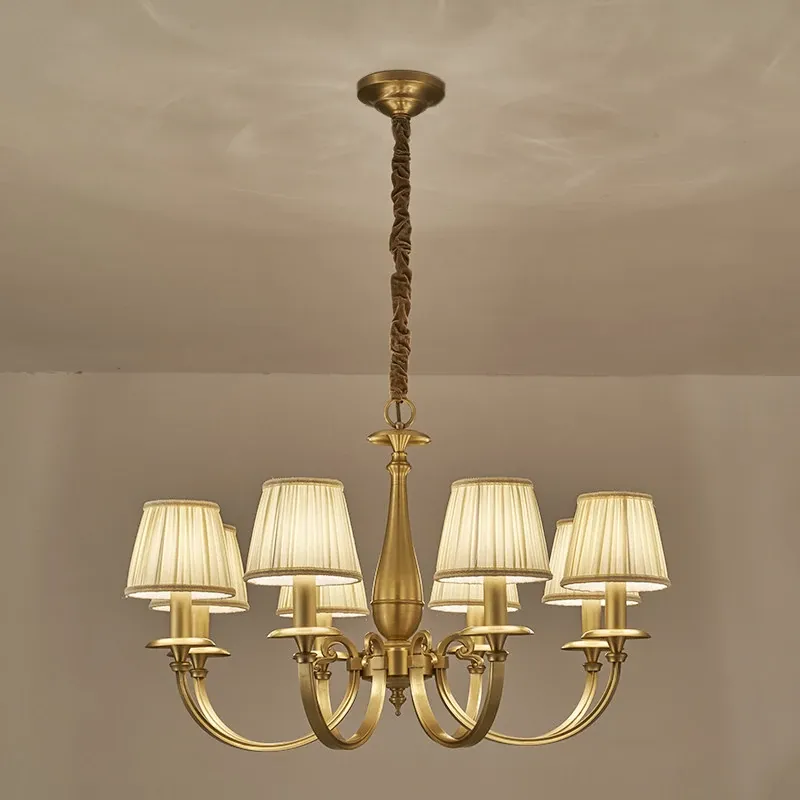 Vintage French Style All-Copper Chandelier - Retro Atmosphere Bedroom Light Fixture, Minimalist American Style Fabric Shade Dining Room Pendant Lamp
