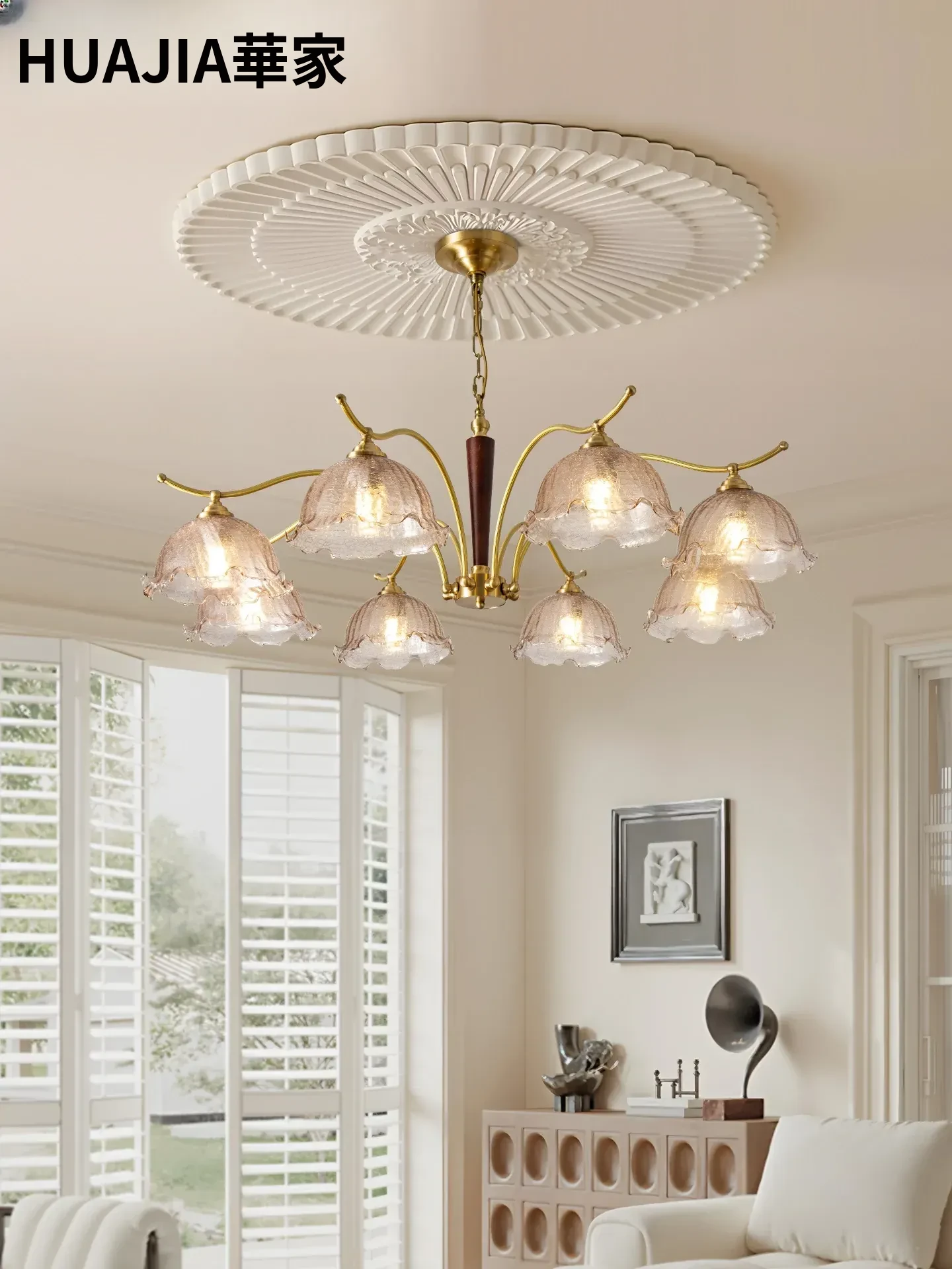 フレンチヴィンテージシャンデリア - リビングルームの主灯、アメリカンスタイルの全銅製と無垢材を使用した寝室用シャンデリア、アートな花びらガラスのダイニングライトで、優雅さと温もりを演出します!
