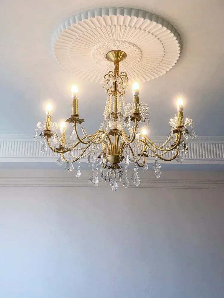 フランス風シャンデリア|リビング・ダイニングに最適なレトロクリスタルパールライト|ラグジュアリーなアメリカンスタイルの真鍮製別荘用キャンドル照明|上品な雰囲気を演出します!