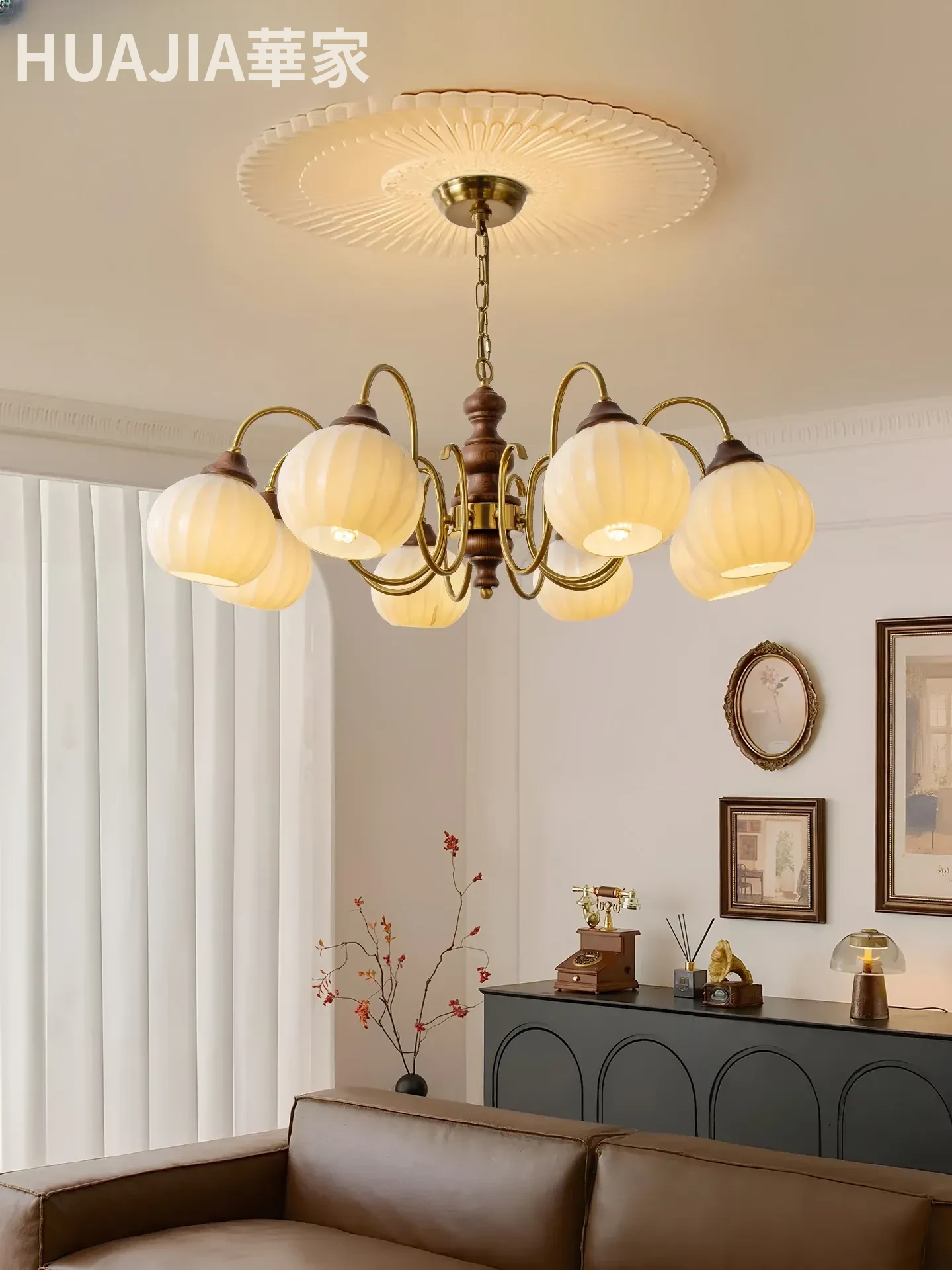 フランス風シャンデリア 中古スタイルのリビングライト アメリカンヴィンテージの雰囲気 演出するウォールナット材とガラスの吊り灯で、心地よい空間を演出します。寝室やダイニングにも最適!