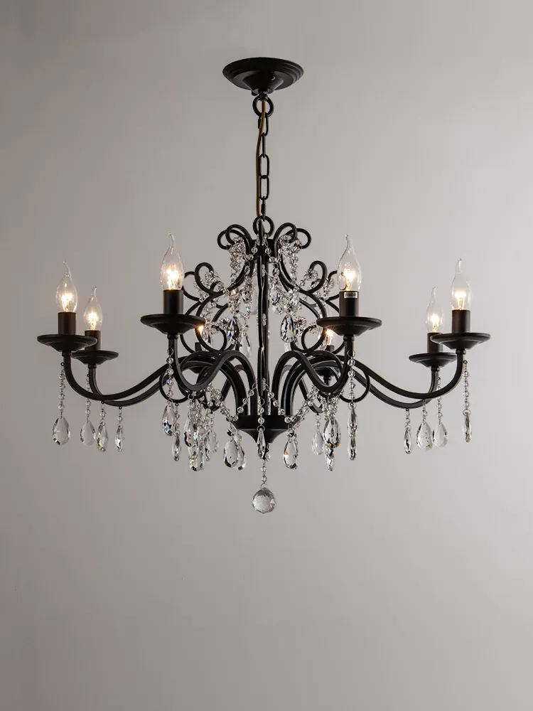 フレンチヴィンテージ風クリスタルシャンデリア|リビングの主灯に最適!アメリカンレトロなブラックデザインで、シンプルながら魅力的なキャンドルスタイルの照明。寝室やダイニングにもぴったり!