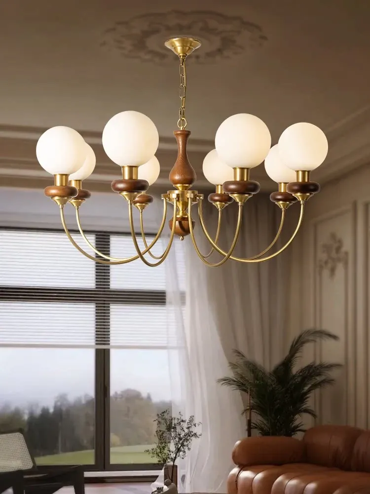 フレンチヴィンテージスタイルの高級インテリア感漂うリビング用シャンデリア、寝室やダイニングにも最適なレトロでシンプルなウォールナットとガラスの吊り灯