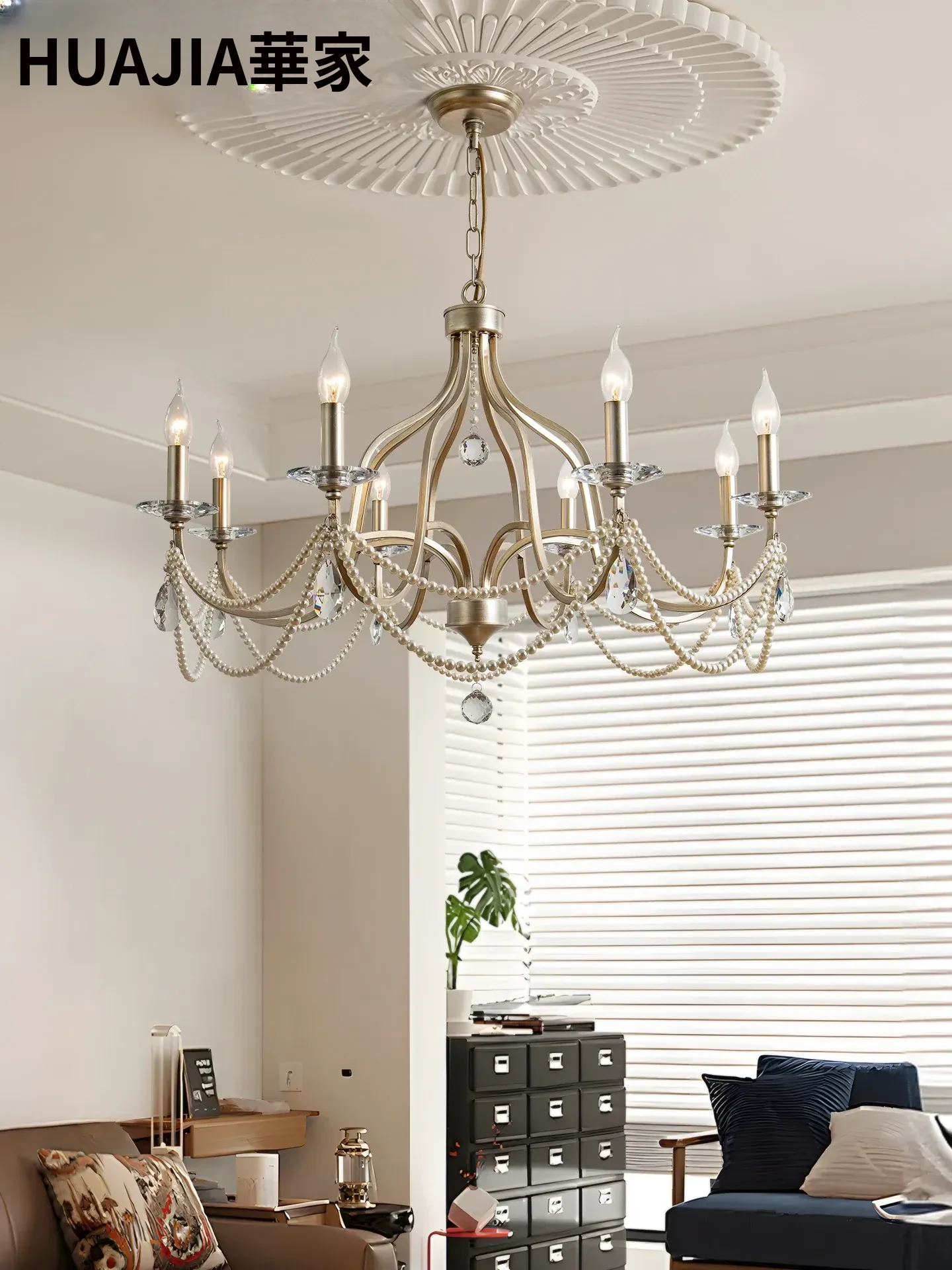 フレンチシャンデリア リビング・ダイニング用 アンティーク調パールクリスタル アメリカンヴィンテージ キャンドルランプ 高級感漂うベッドルームライティング