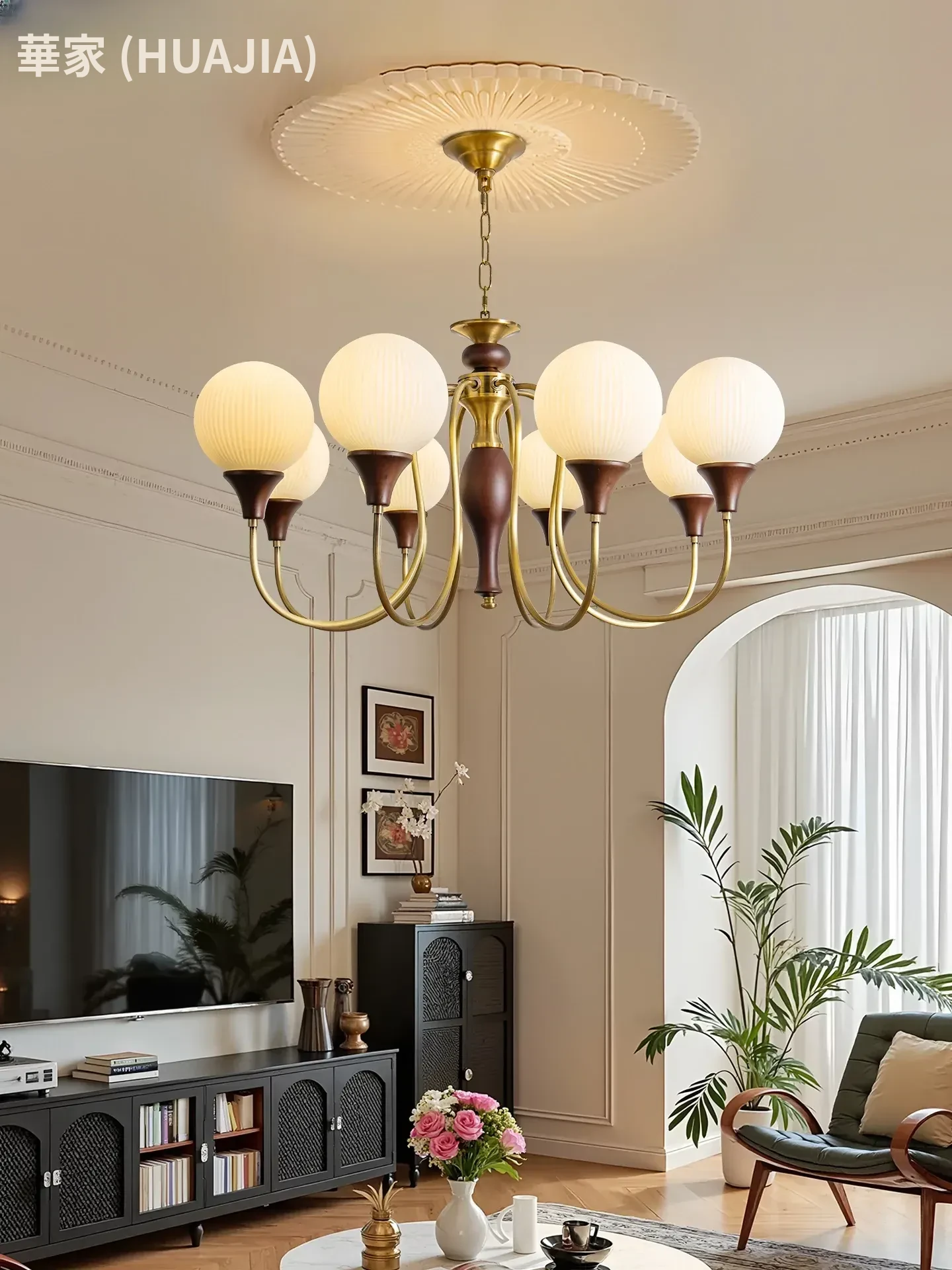 フランス風ヴィンテージリビングルームシャンデリア アメリカンレトロなウォールナット材 バウハウススタイルの寝室・ダイニング用ガラスシャンデリアで、優雅な雰囲気を演出!おしゃれな空間作りに最適!