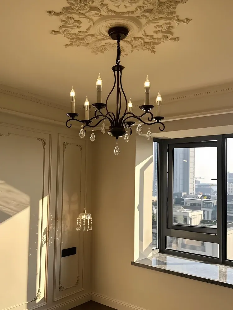 アメリカンスタイルのシャンデリア|リビング・ダイニングに最適!カントリー調の贅沢感漂うフレンチデザイン|レトロキャンドル型のクリスタルライトで、心地よい雰囲気を演出します。