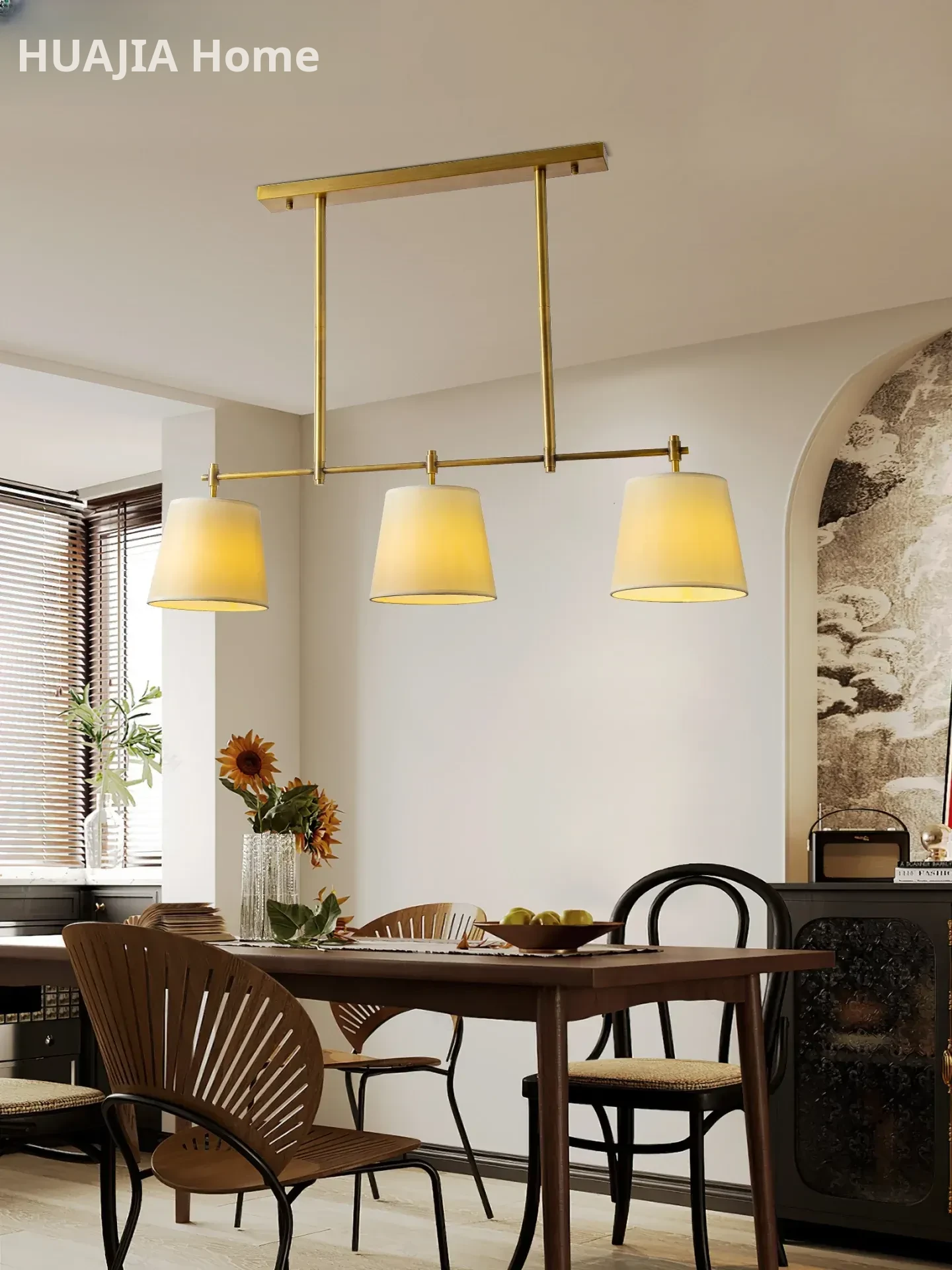 French Vintage Restaurant Chandelier - American Retro All-Copper Fabric Bar Light, Stylish Long Rectangular Dining Table Pendant Lamp