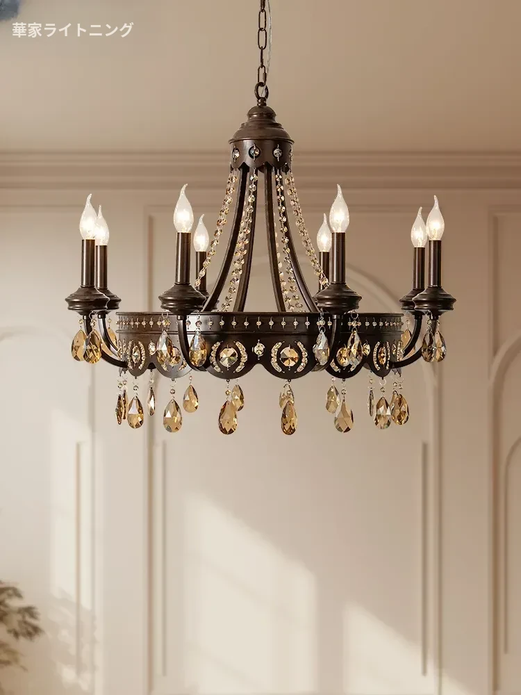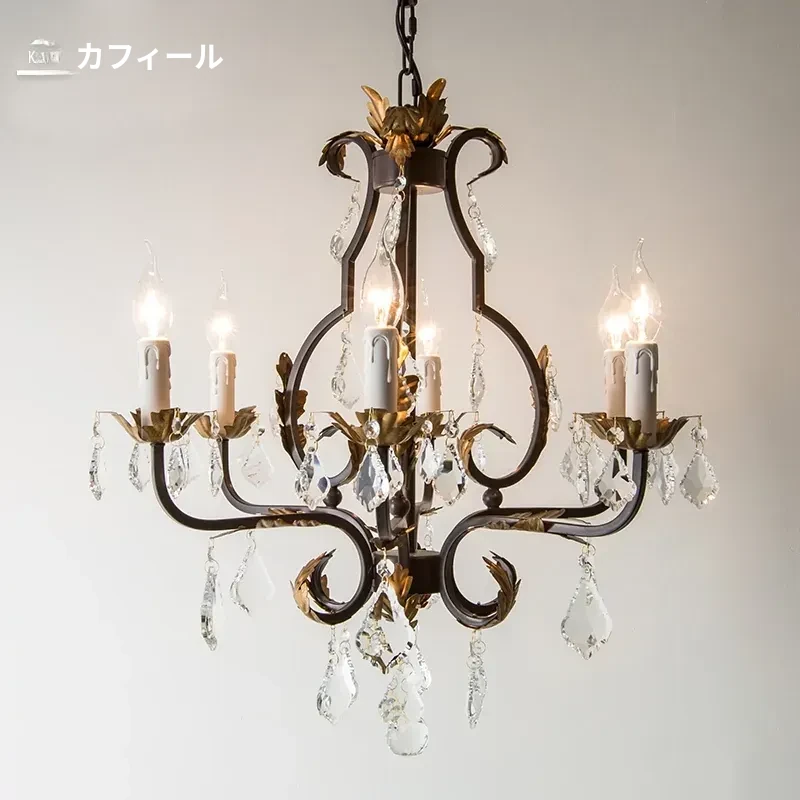 アメリカンカントリースタイルのシャンデリア|ダイニングテーブルや食堂に最適なレトロなサビ色のキャンドルクリスタルシャンデリア|お部屋の装飾にもぴったり!温かみのある雰囲気を演出します。
