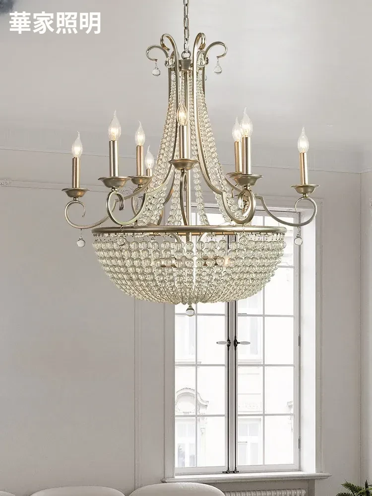 アメリカンカントリースタイルのアイアンシャンデリア!クリエイティブでシンプルなデザイン、レトロなシルバー仕上げが魅力。フランス製のクリスタルが輝く、リビングやダイニング、寝室にぴったりの照明器具です。