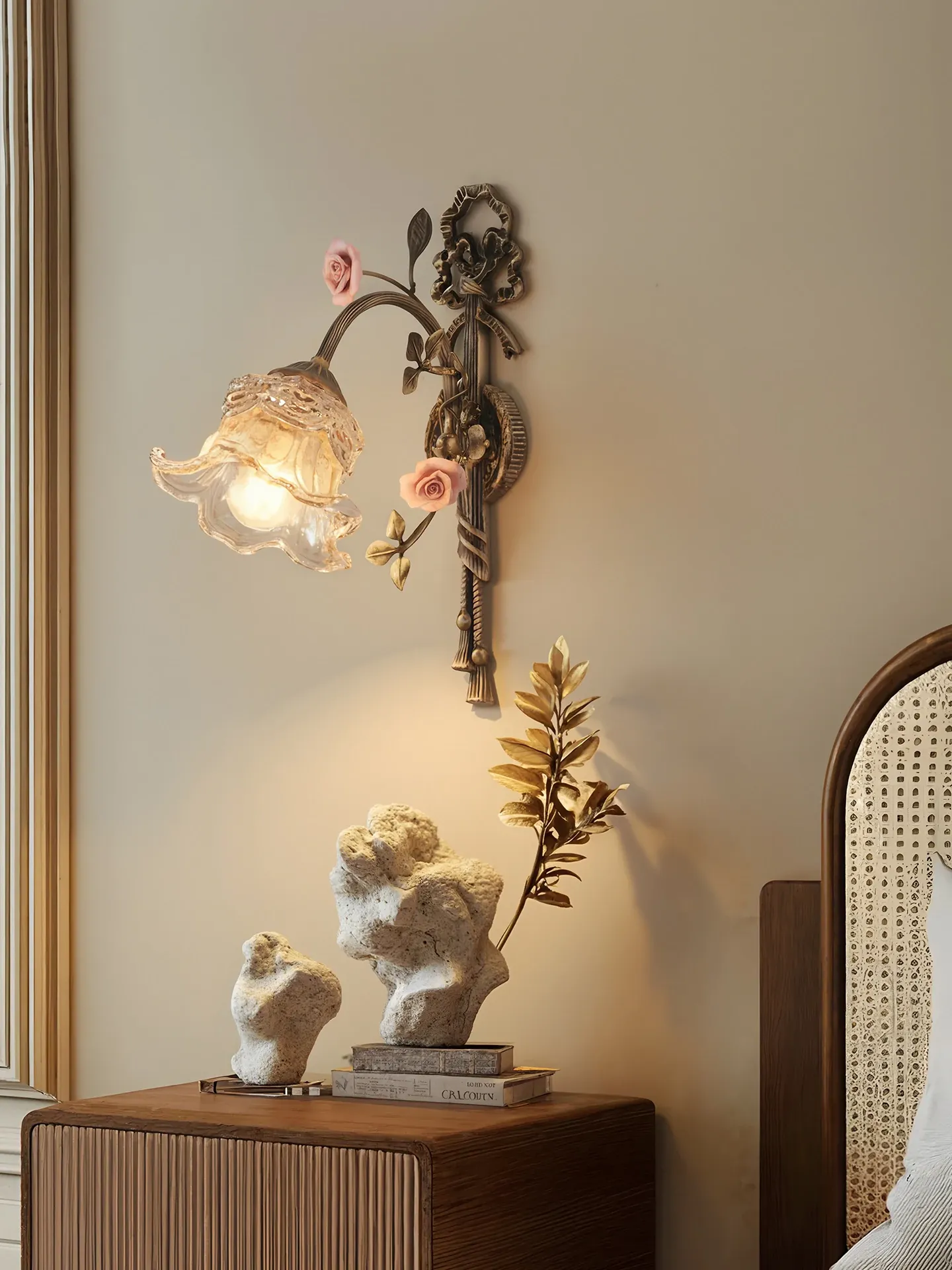 アメリカンヴィンテージスタイルの高級感漂う花モチーフ壁灯 - 寝室やベッドサイドにぴったりな、エレガントなアンティークテイストの照明。廊下や階段を美しく照らし出します。