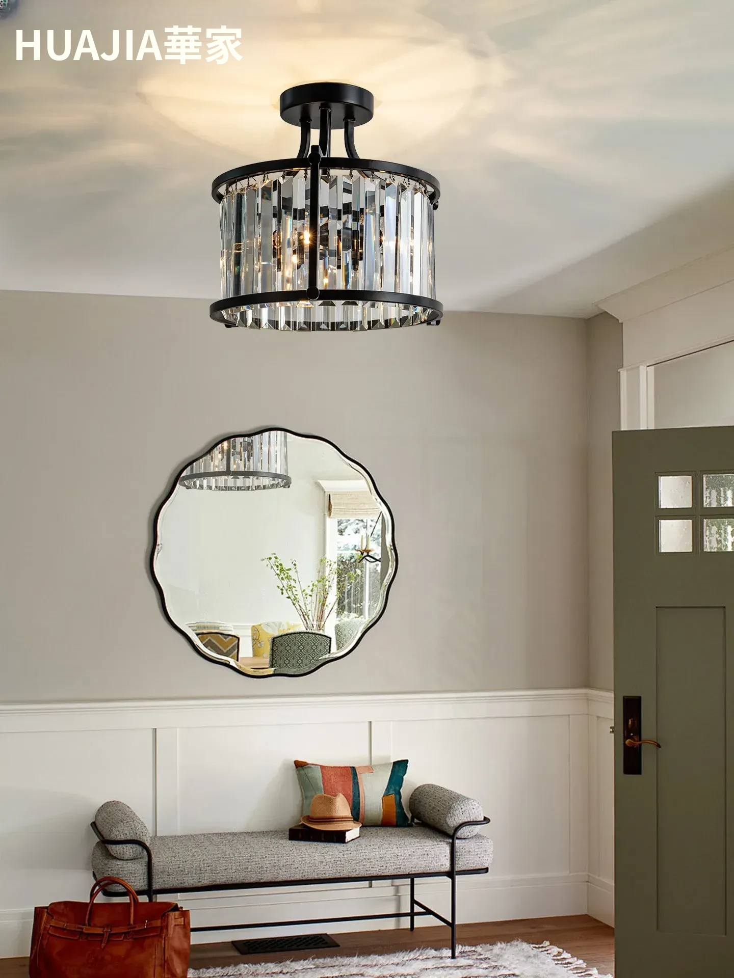 フレンチスタイルシーリングライト|ラグジュアリークリスタルの寝室用|アメリカンブラックミニマリストデザイン|書斎やダイニングにも最適なハーフペンダントシーリングライト!洗練された空間を演出します。
