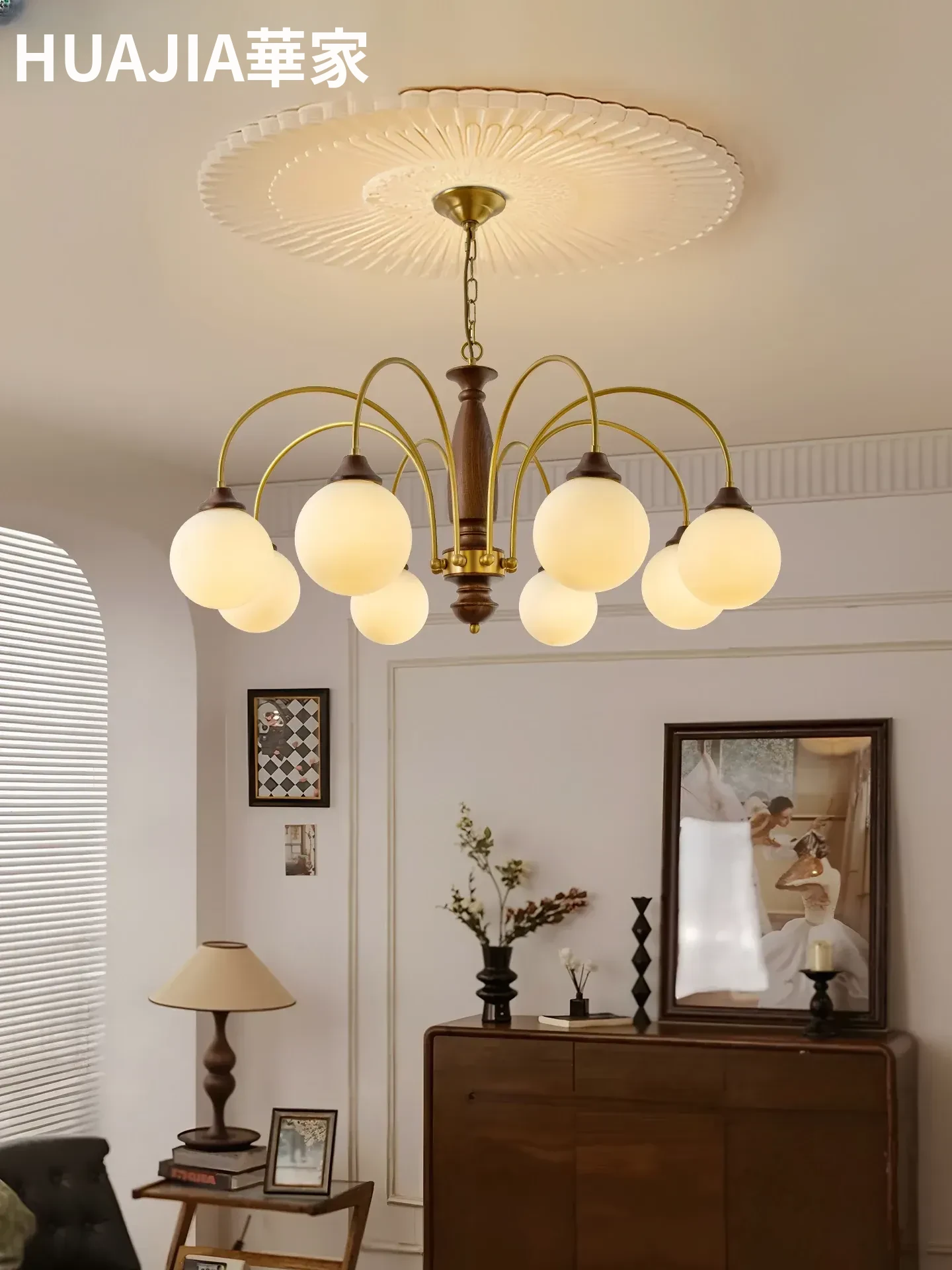 フレンチヴィンテージスタイルの高級インテリア感漂うリビング用シャンデリア、寝室やダイニングにも最適なレトロでシンプルなウォールナットとガラスの吊り灯