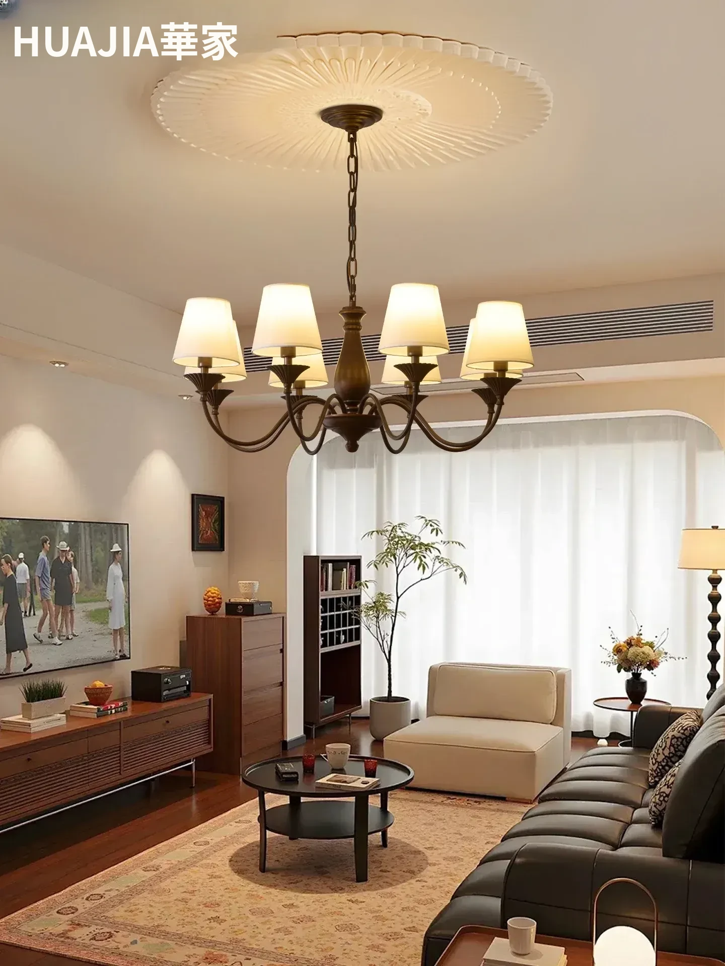 アメリカンビンテージ風シャンデリア|フレンチレトロデザインのシンプルでスタイリッシュな布製ランプシェード|リビングやダイニング、寝室にぴったりの大人の雰囲気を演出する照明