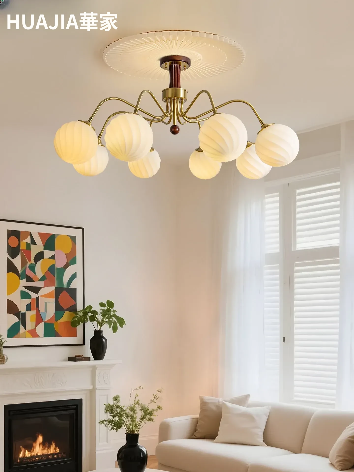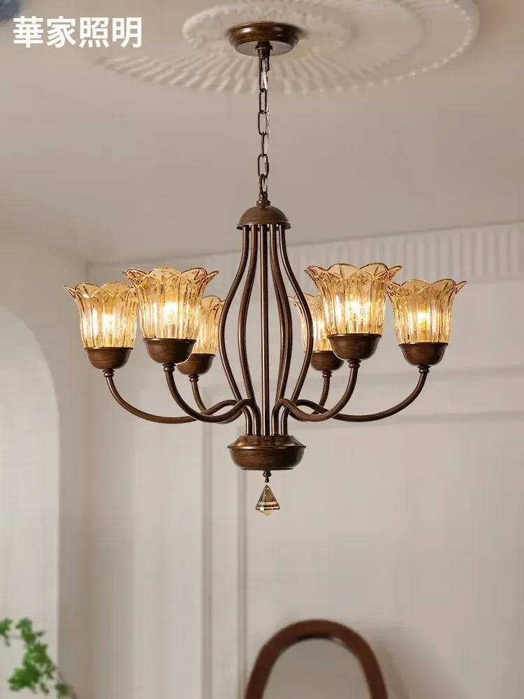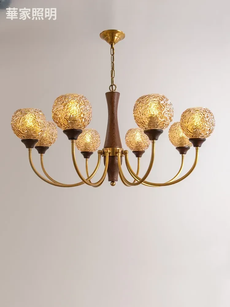 アメリカンビンテージシャンデリア - フレンチスタイルの上品な胡桃色木製ランプ、豪華なガラスのデザインで、リビングやダイニング、寝室にぴったりの高級感あふれる照明器具です。
