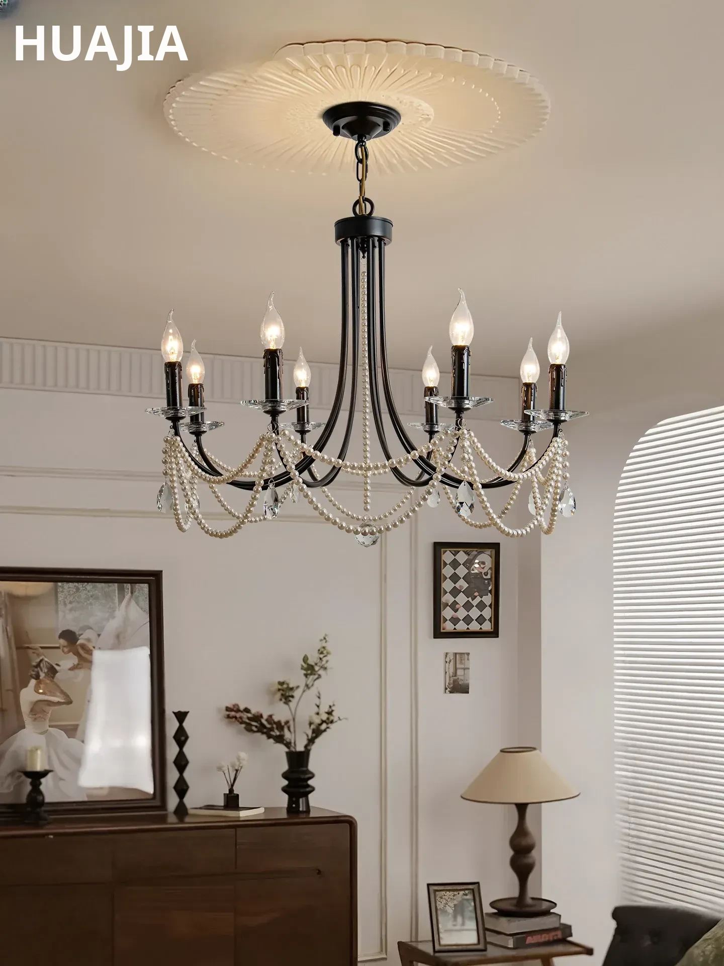 French Pearl Chandelier - Elegant Black Crystal Lighting for Living Room, Minimalist American Style Candle Lights for Bedroom and Dining Room - Perfect for Creating a Luxurious Atmosphere