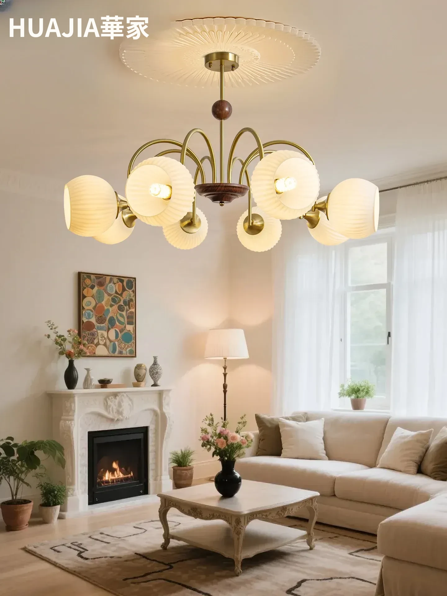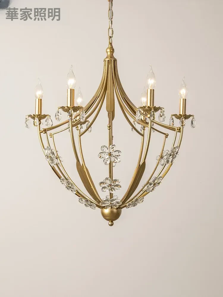 フレンチスタイルのシャンデリア!アンティーク風のリビング用吊り灯。シンプルでおしゃれな花びらガラスと全銅素材の美しいデザイン。寝室、ダイニングルーム、書斎にぴったりな照明器具です。あなたの空間を優雅に演出します!