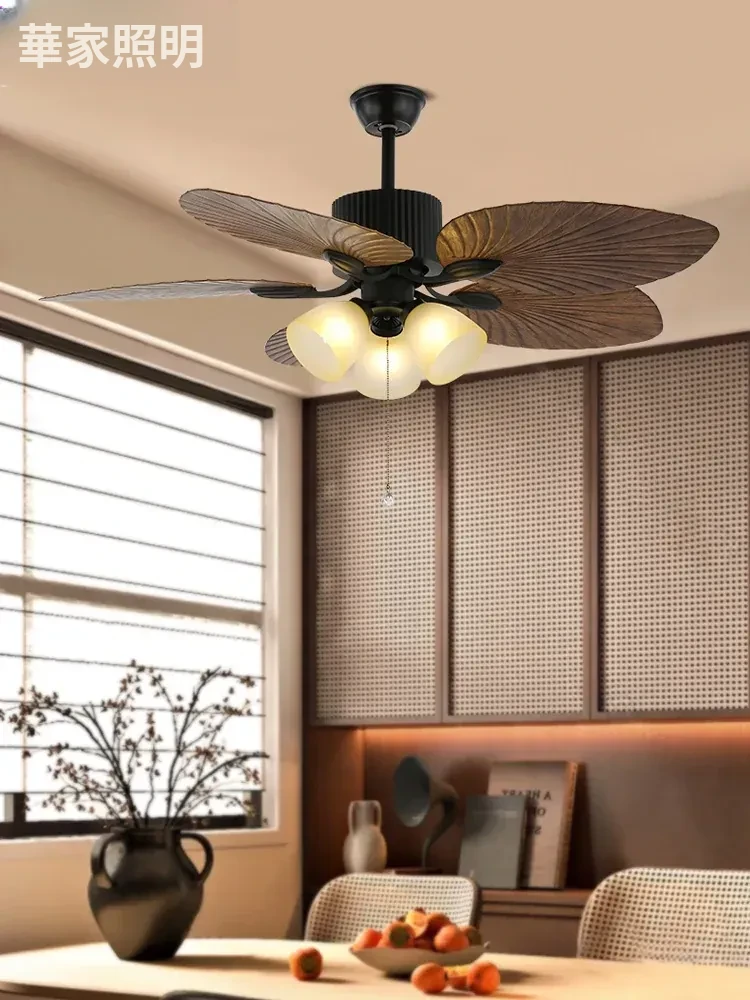 アメリカンレトロ風ファンライト - レストランやベッドルームにぴったり!東南アジアの葉デザインの吊り扇と中世風のロフト工業スタイルで、スタイリッシュな空間を演出します。