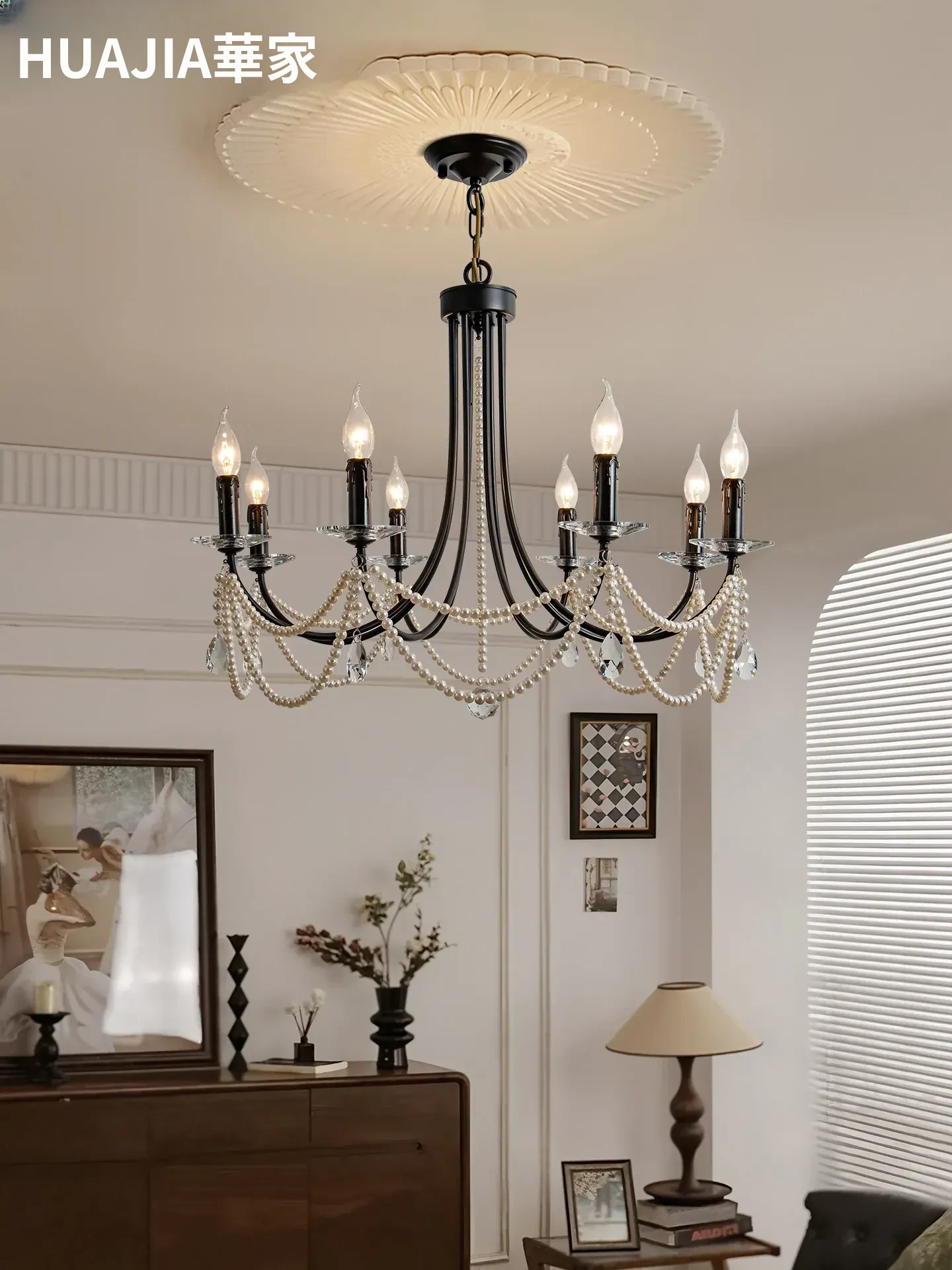 フランス風ペンダントライト - 珍珠デザインのリビング用シャンデリア。アメリカンスタイルのラグジュアリーなシンプルさ。ブラッククリスタルが魅力のベッドルームやダイニング用キャンドルライト。おしゃれで上質な空間を演出します!