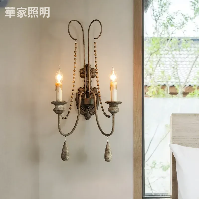 アメリカンカントリー風のウッドアート壁灯 - レトロなフレンチスタイルで、寝室やリビングにぴったりの二灯式キャンドルウォールランプ。おしゃれな背景壁を演出し、温かみのある雰囲気を作り出します。