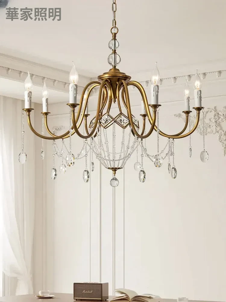 フレンチビンテージシャンデリア|全銅製・軽奢華デザイン|ブロックストーンクリスタルキャンドルライト|ロマンティックな寝室やリビング、ダイニングにも最適な照明器具!