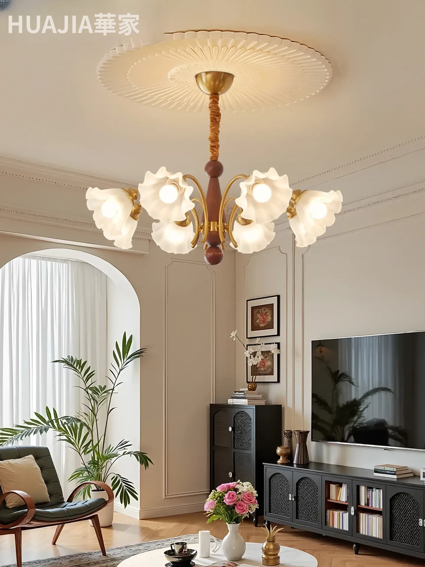 フレンチビンテージシャンデリア - リビングルームにぴったりなアメリカンレトロスタイルの実木とガラスの花びらデザイン。寝室やダイニング、書斎にも最適な洗練された照明で、空間を華やかに演出します。