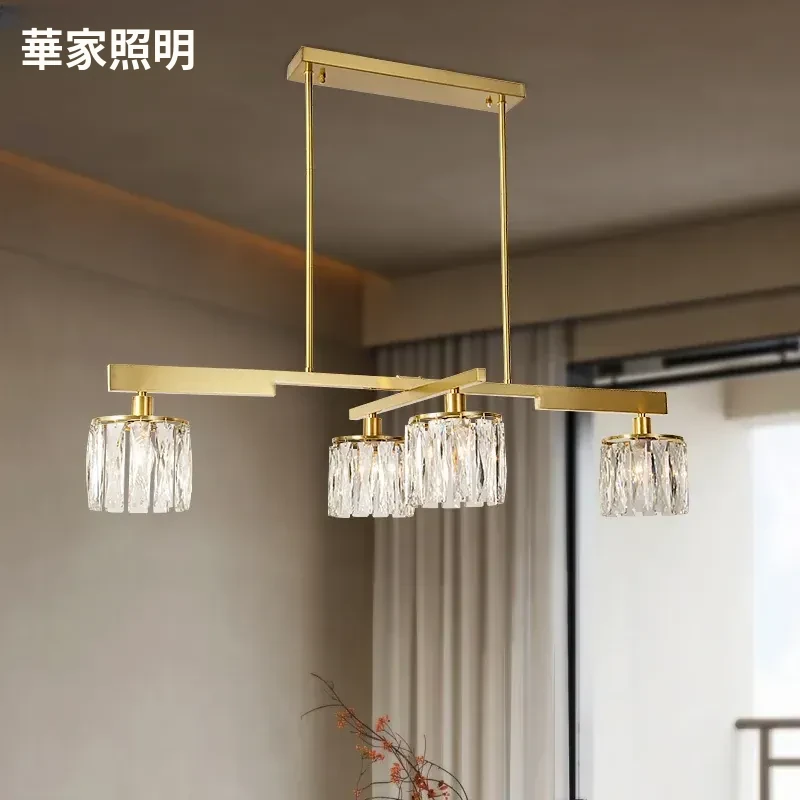 アメリカンスタイル全銅製レストラン用ペンダントライト - シンプルでエレガントな長方形デザイン、ダイニングテーブルに最適!高級感あふれるクリスタルの一字型バーライトで、あなたの食卓を華やかに演出します。