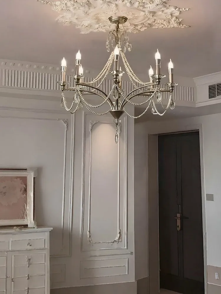 フランス風シャンデリア - リビング・ダイニングに最適なシンプルで美しいアメリカンビンテージスタイルのクリスタルライト。ラグジュアリーなパールデザインで、主寝室を上品に演出します。