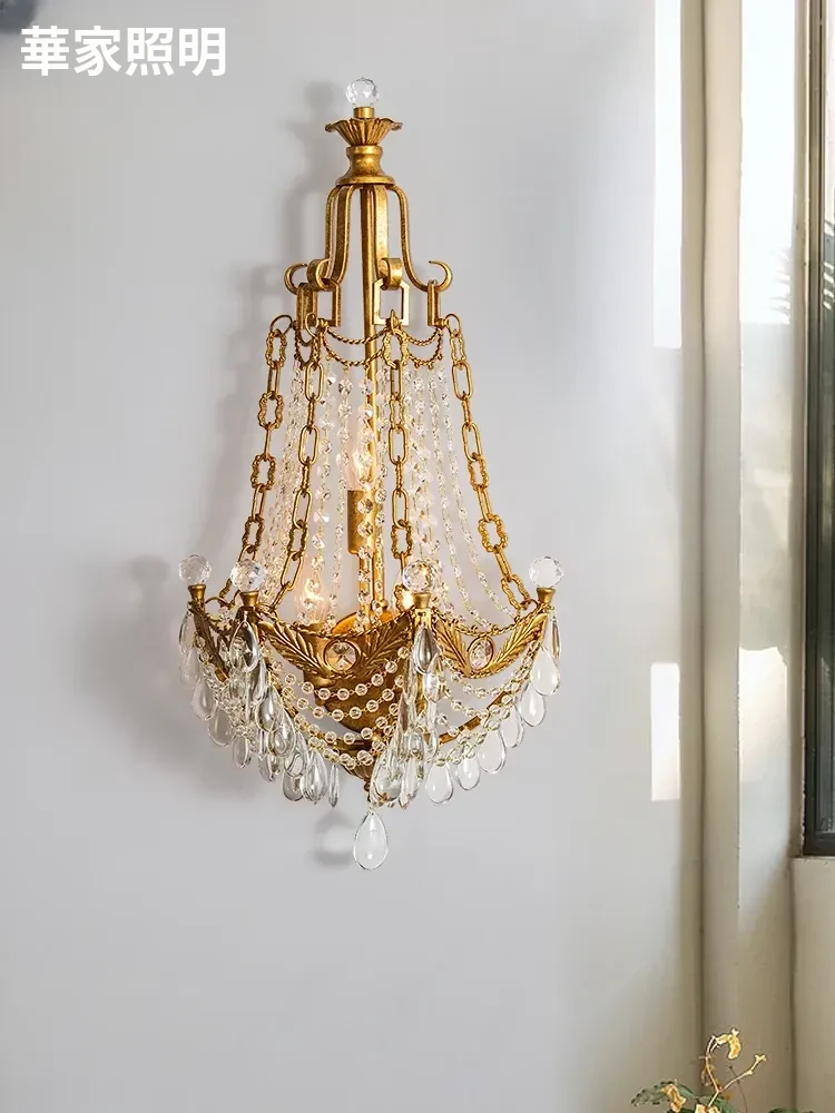 アメリカンスタイルのクリスタル壁灯 - おしゃれなリビングの背景壁にぴったり!フレンチコートスタイルのヴィンテージ調クラウンデザイン、アンティークブロンズ仕上げで高級感あふれる別荘の壁灯。